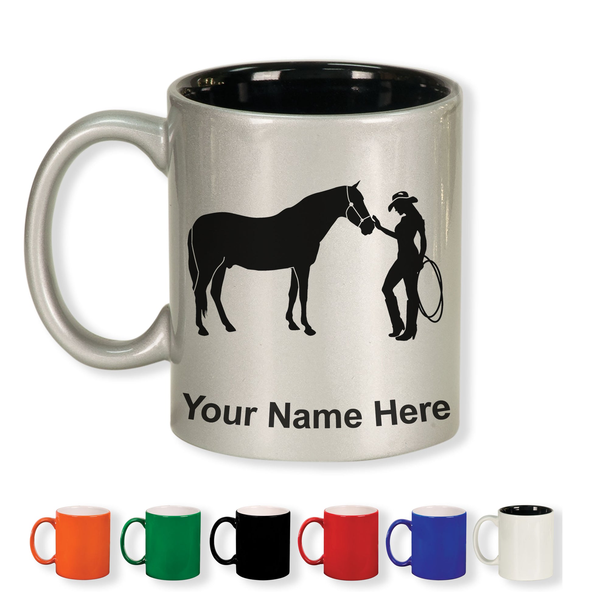 11oz Round Ceramic Coffee Mug, Horse and Cowgirl, Personalized Engraving Included