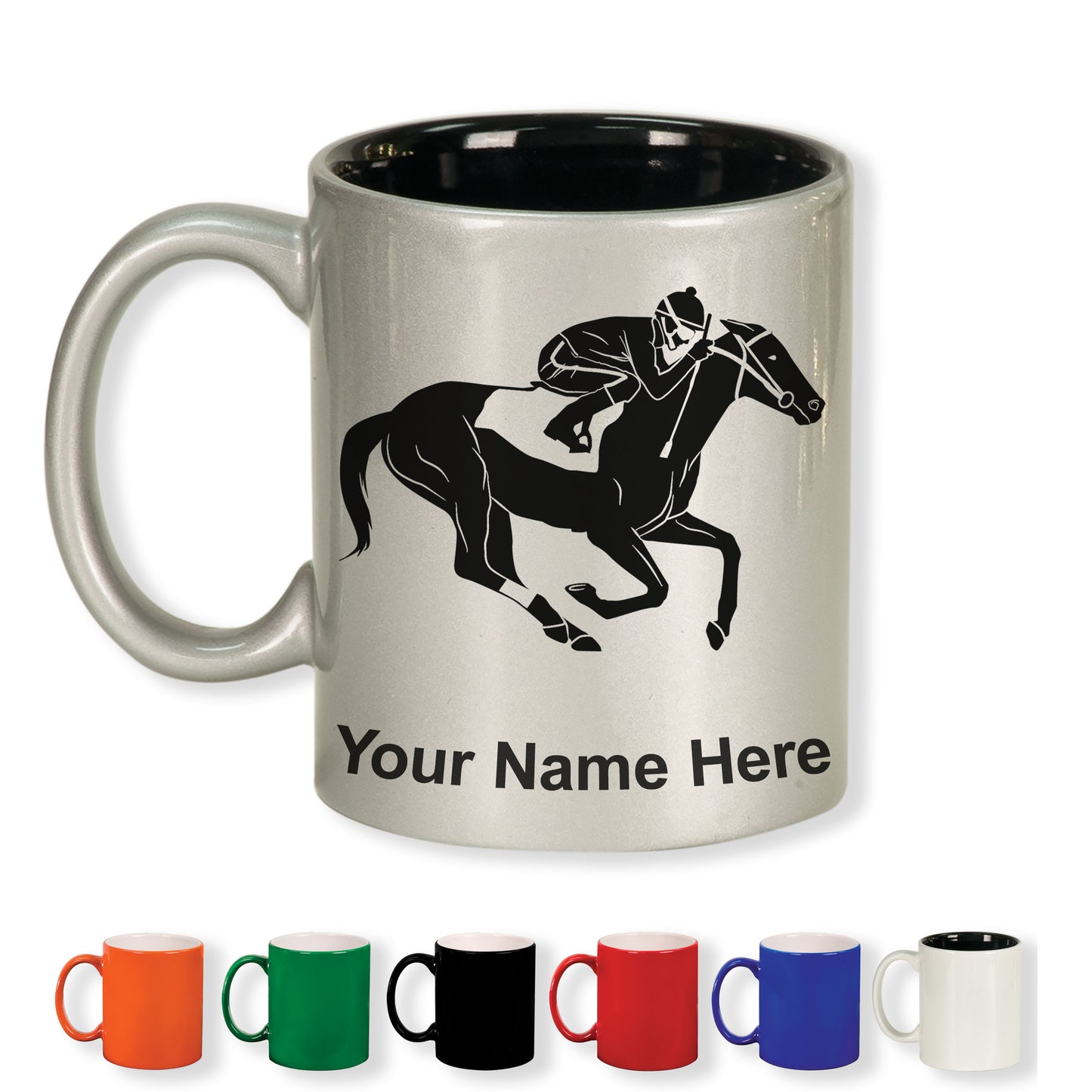 11oz Round Ceramic Coffee Mug, Horse Racing, Personalized Engraving Included