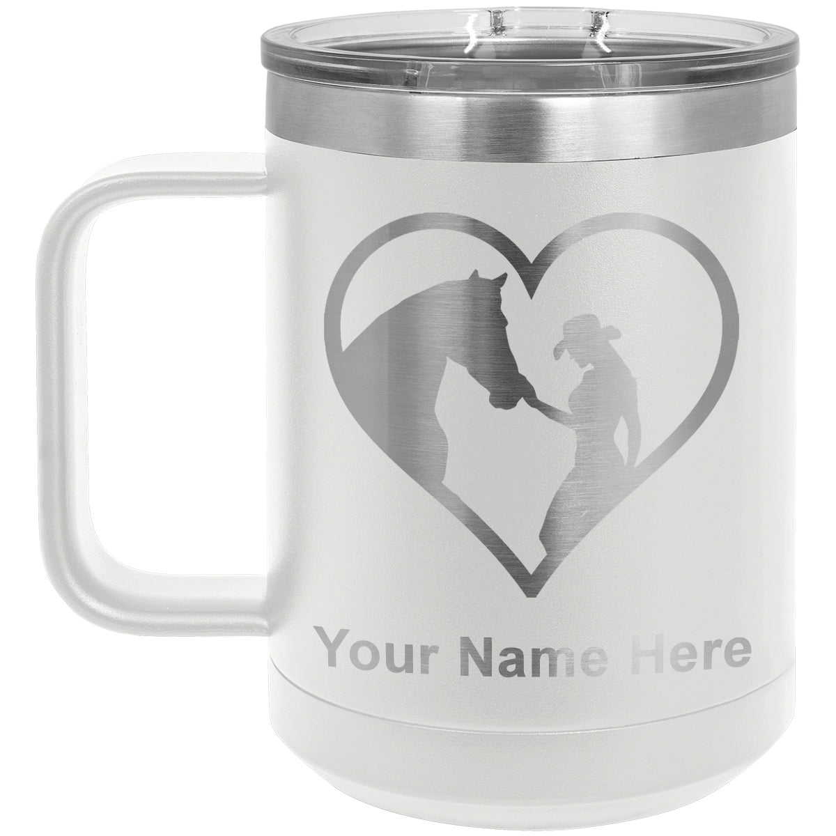 15oz Vacuum Insulated Coffee Mug, Horse Cowgirl Heart, Personalized Engraving Included