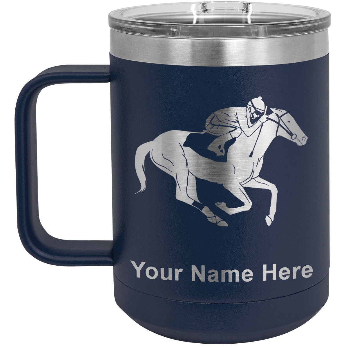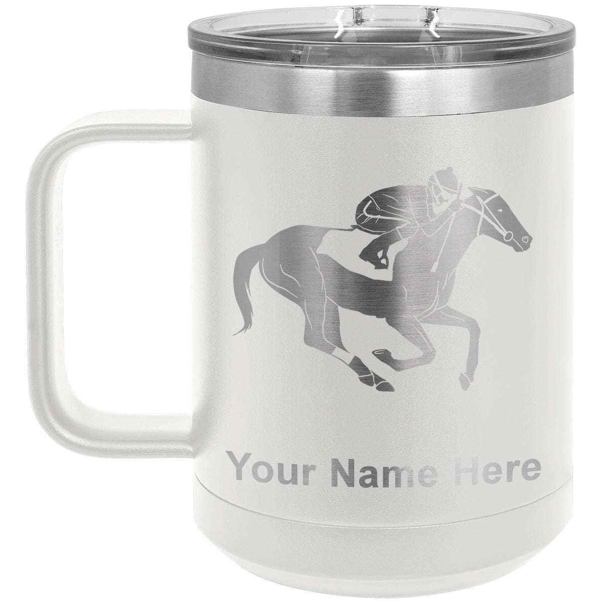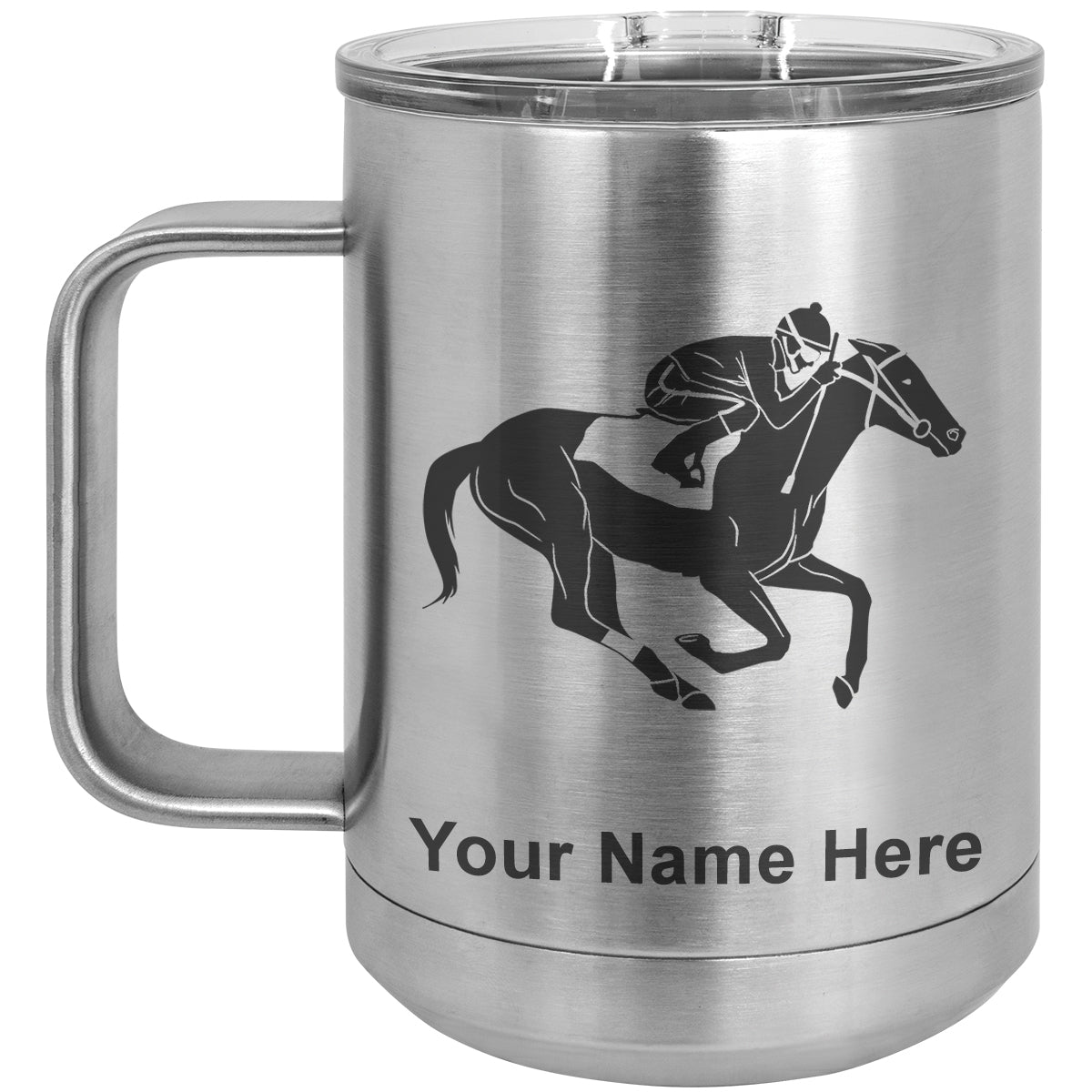 15oz Vacuum Insulated Coffee Mug, Horse Racing, Personalized Engraving Included