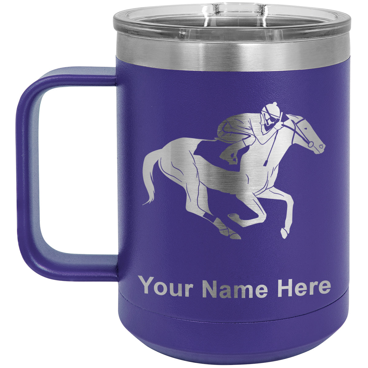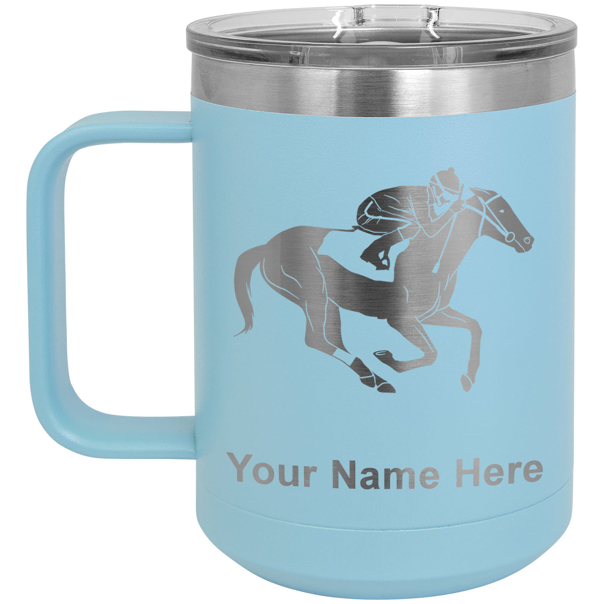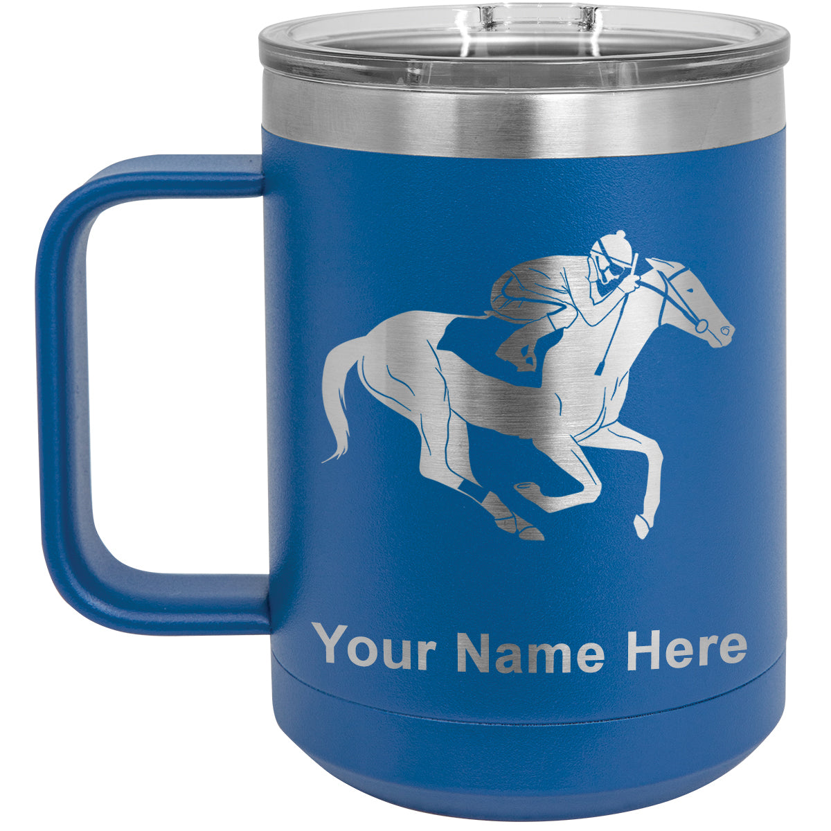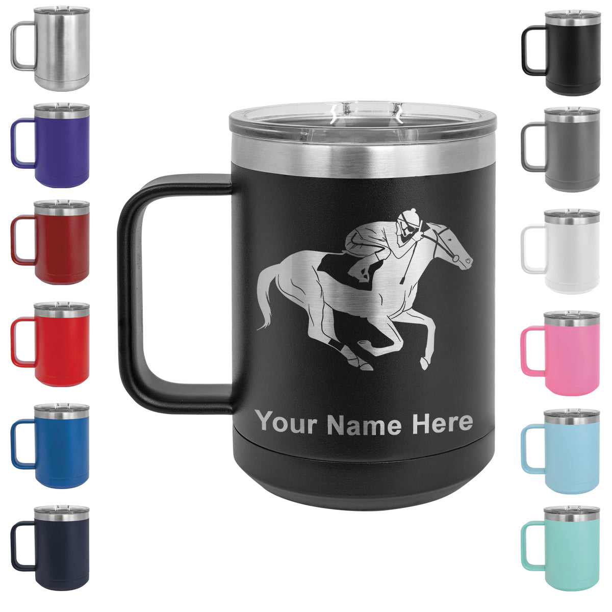 15oz Vacuum Insulated Coffee Mug, Horse Racing, Personalized Engraving Included