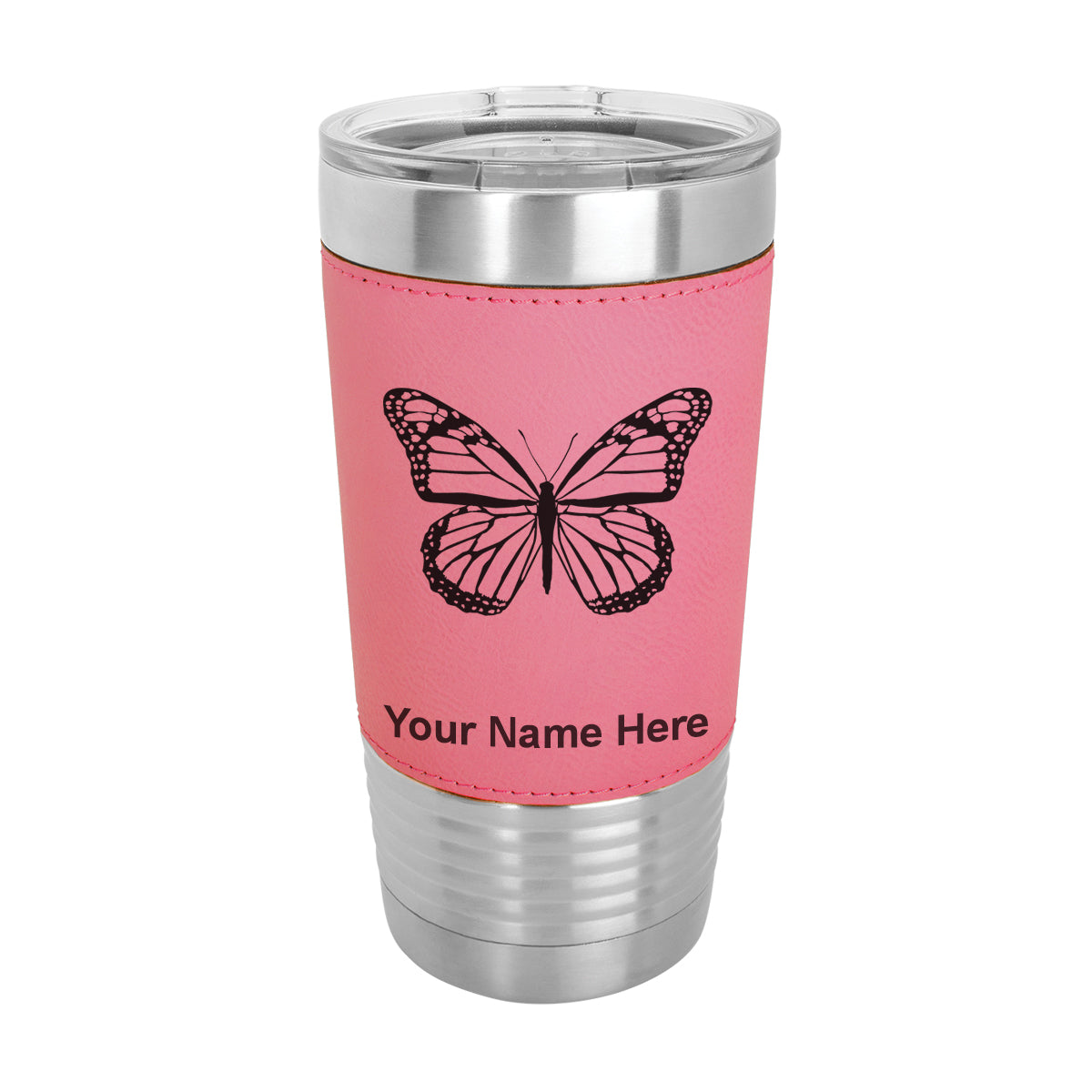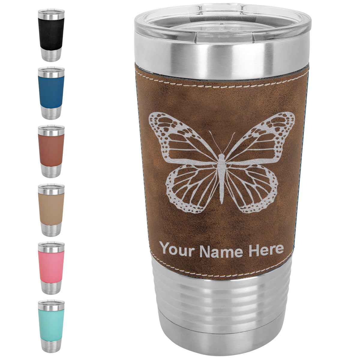 20oz Faux Leather Tumbler Mug, Monarch Butterfly, Personalized Engraving Included