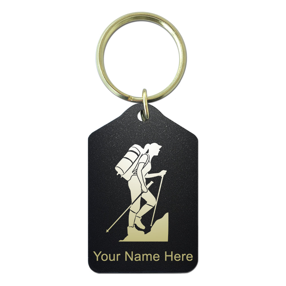 Black Metal Keychain, Hiker Woman, Personalized Engraving Included