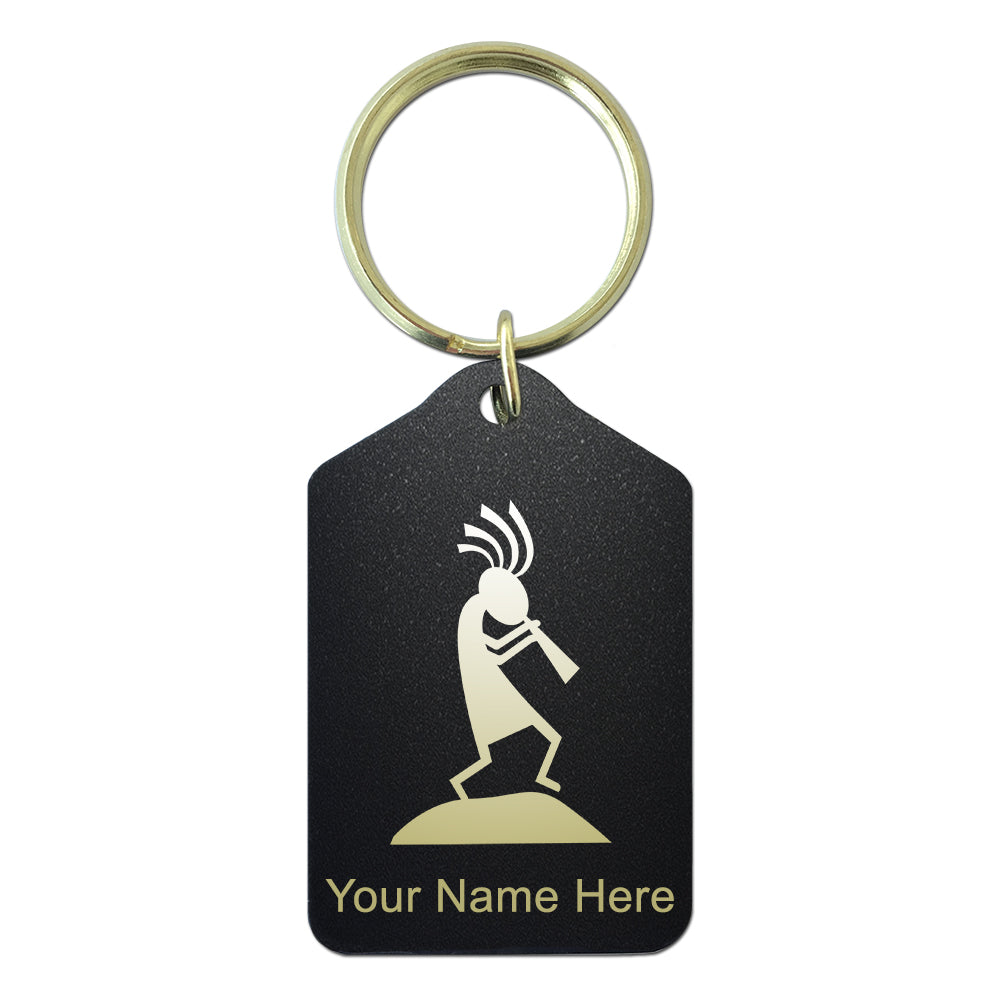 Black Metal Keychain, Kokopelli, Personalized Engraving Included