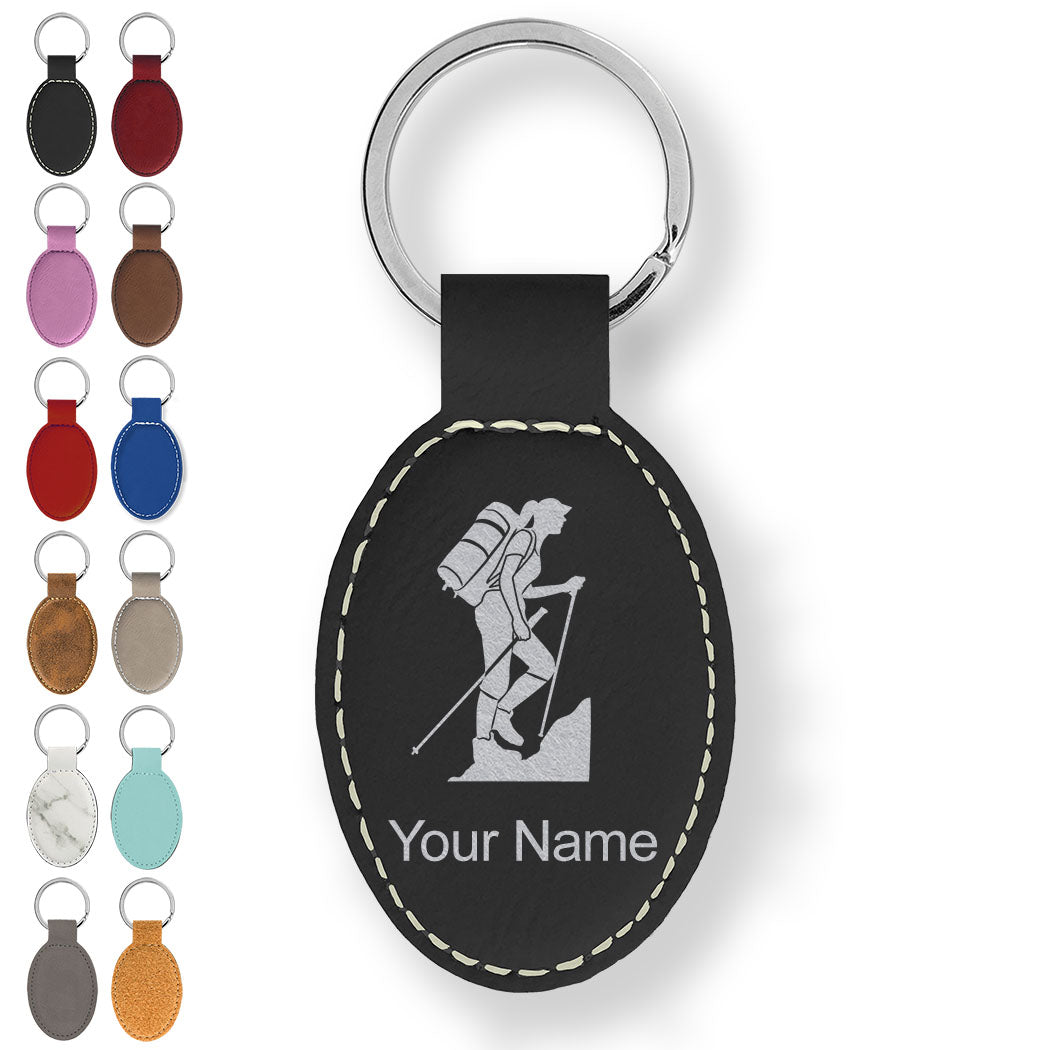 Faux Leather Oval Keychain, Hiker Woman, Personalized Engraving Included