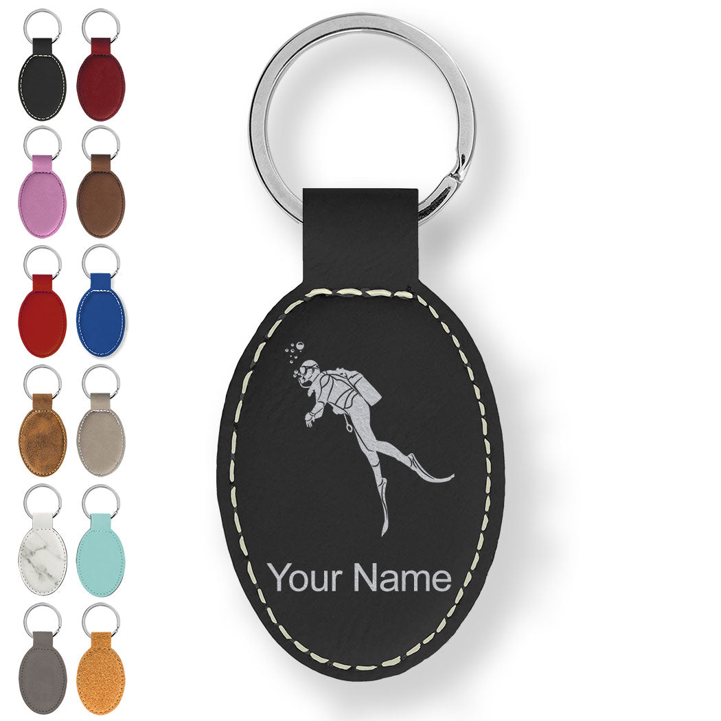 Faux Leather Oval Keychain, Scuba Diver, Personalized Engraving Included