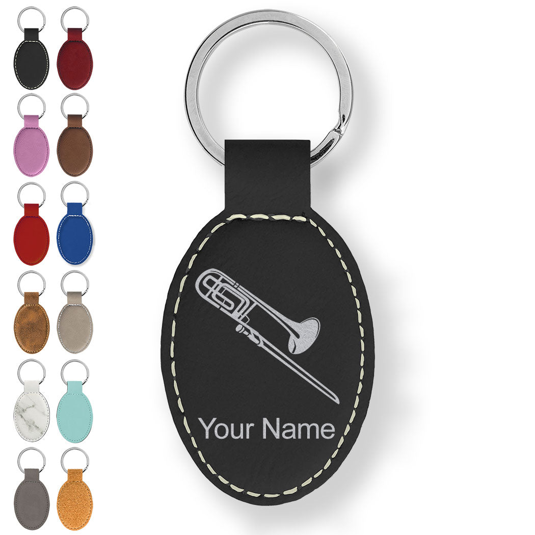 Faux Leather Oval Keychain, Trombone, Personalized Engraving Included