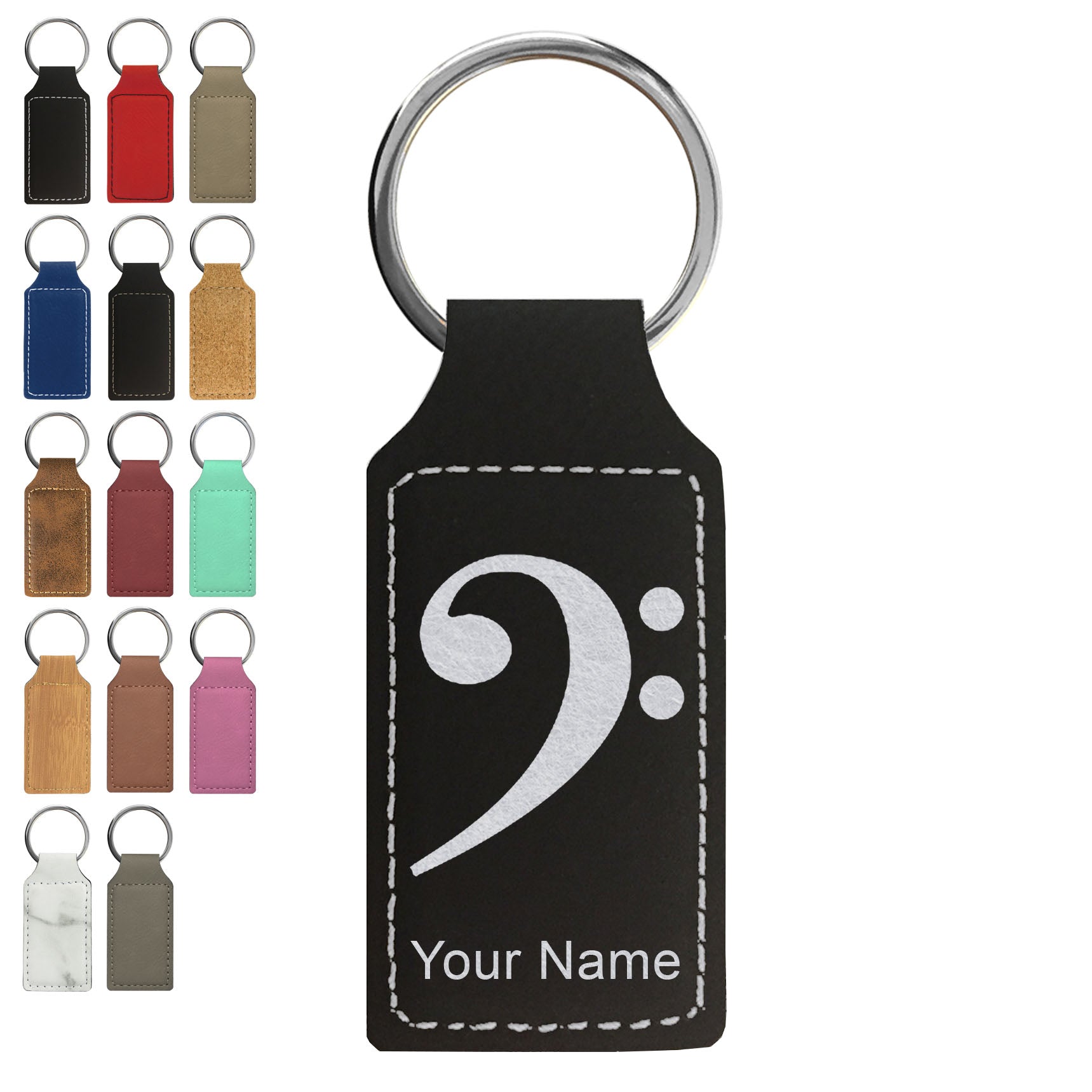 Faux Leather Rectangle Keychain, Bass Clef, Personalized Engraving Included