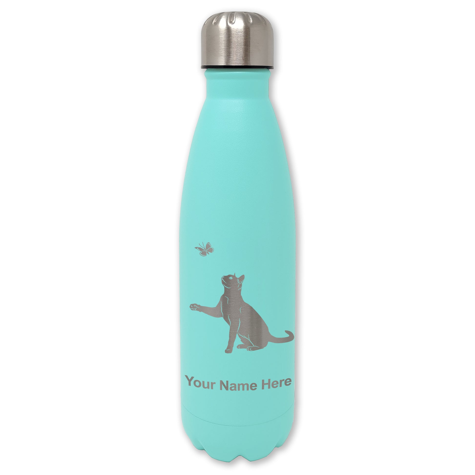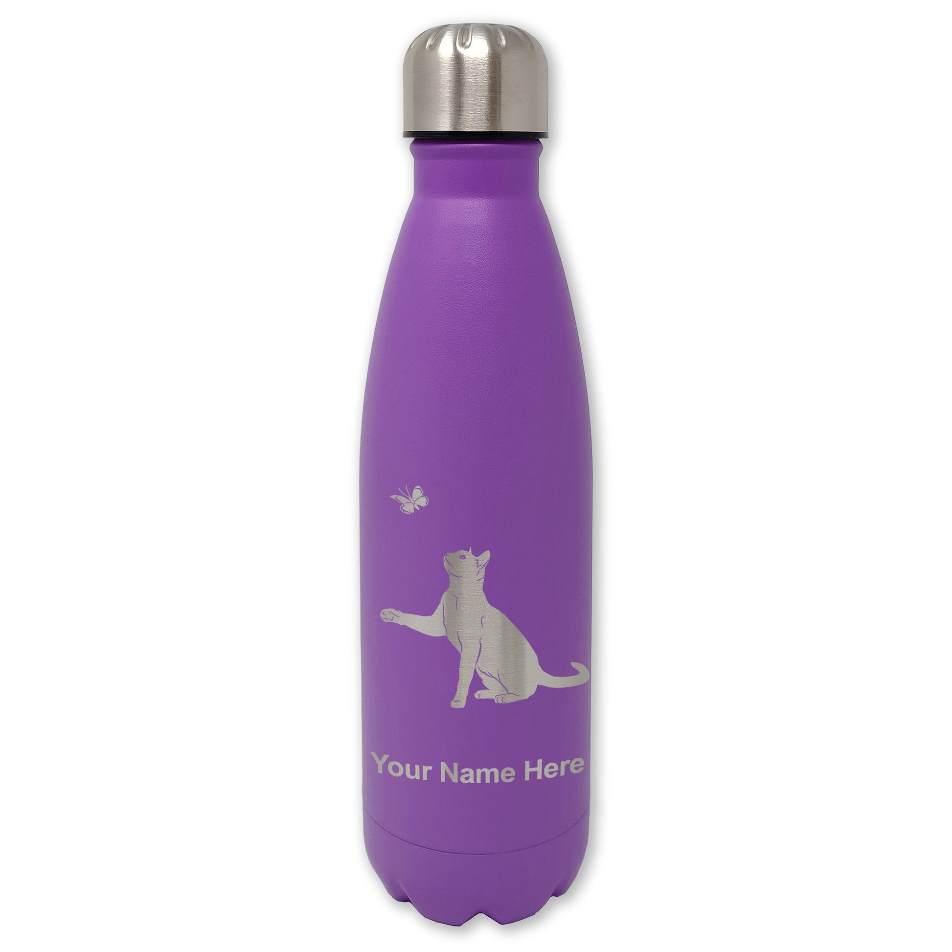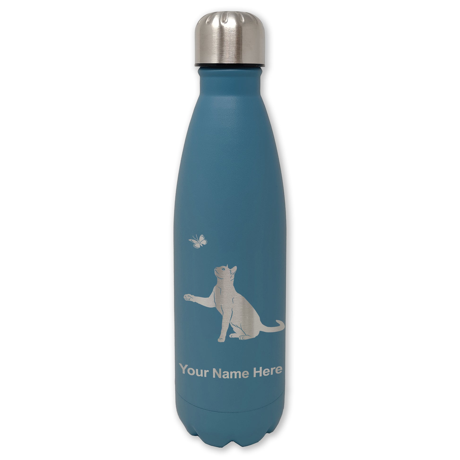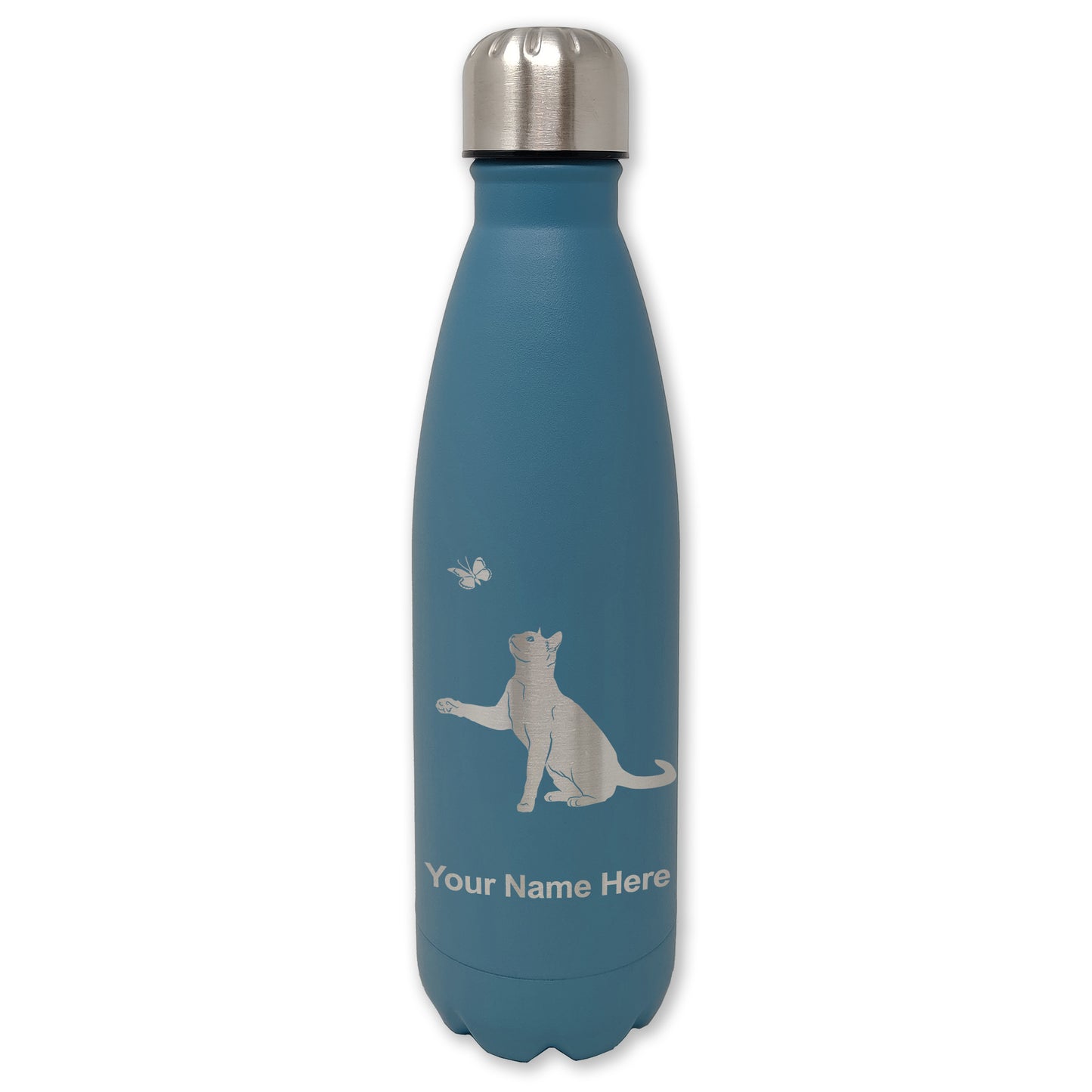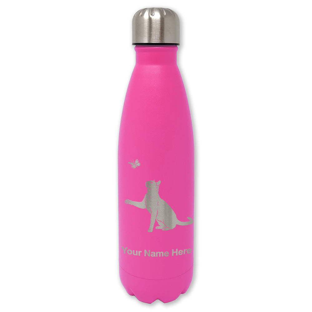 LaserGram Double Wall Water Bottle, Cat with Butterfly, Personalized Engraving Included