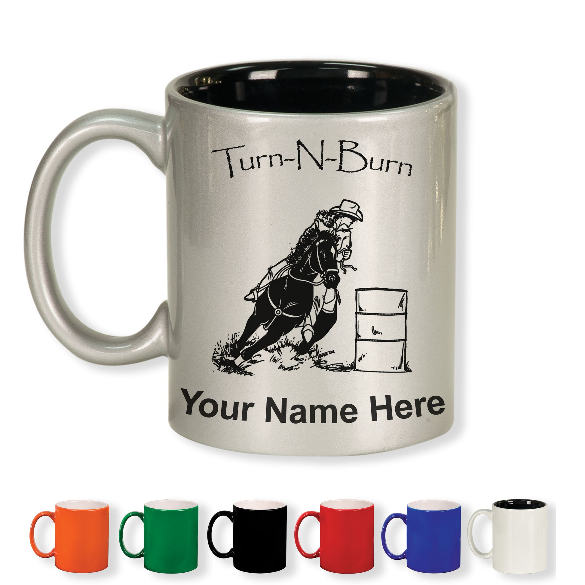 11oz Round Ceramic Coffee Mug, Barrel Racer Turn N Burn, Personalized Engraving Included