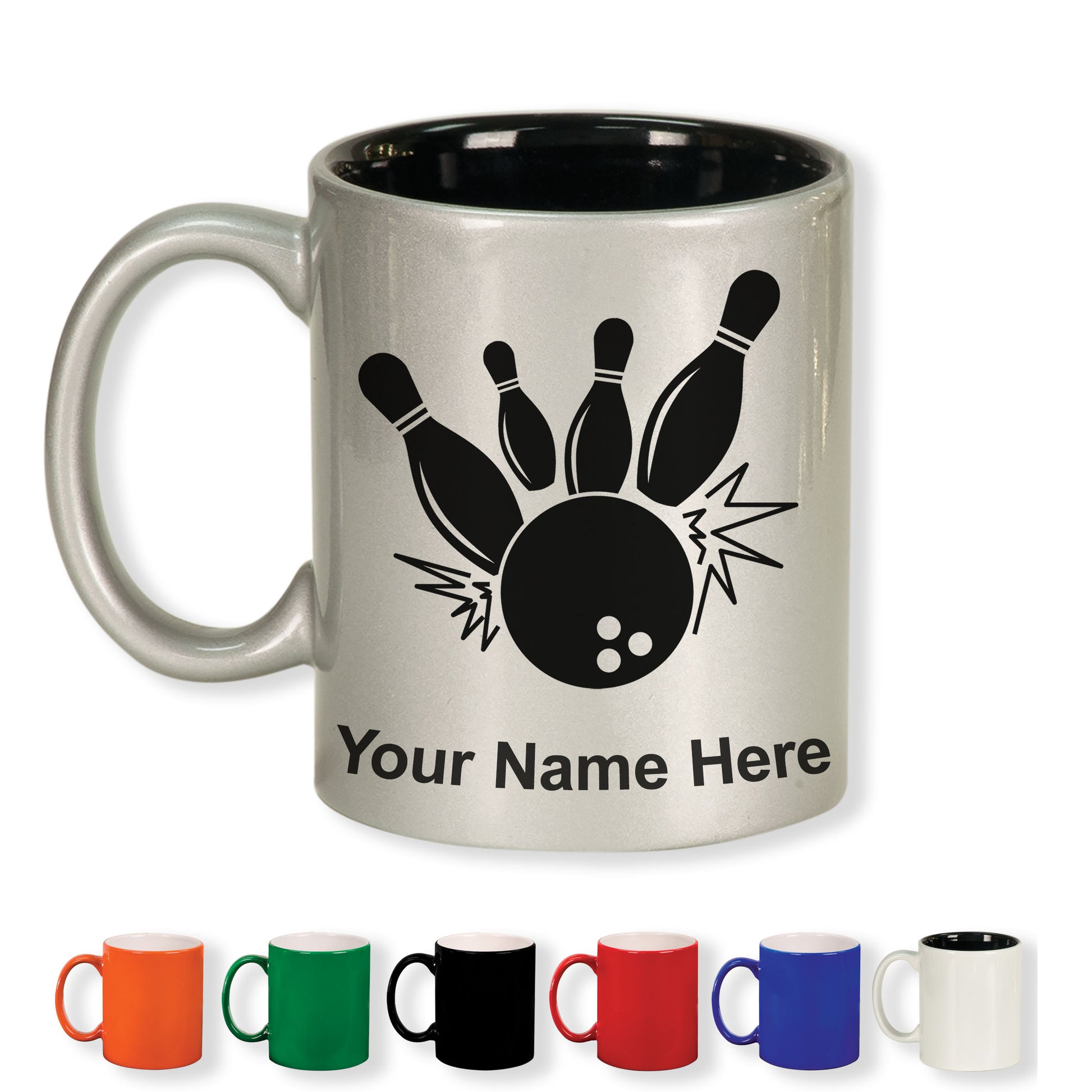 11oz Round Ceramic Coffee Mug, Bowling Ball and Pins, Personalized Engraving Included