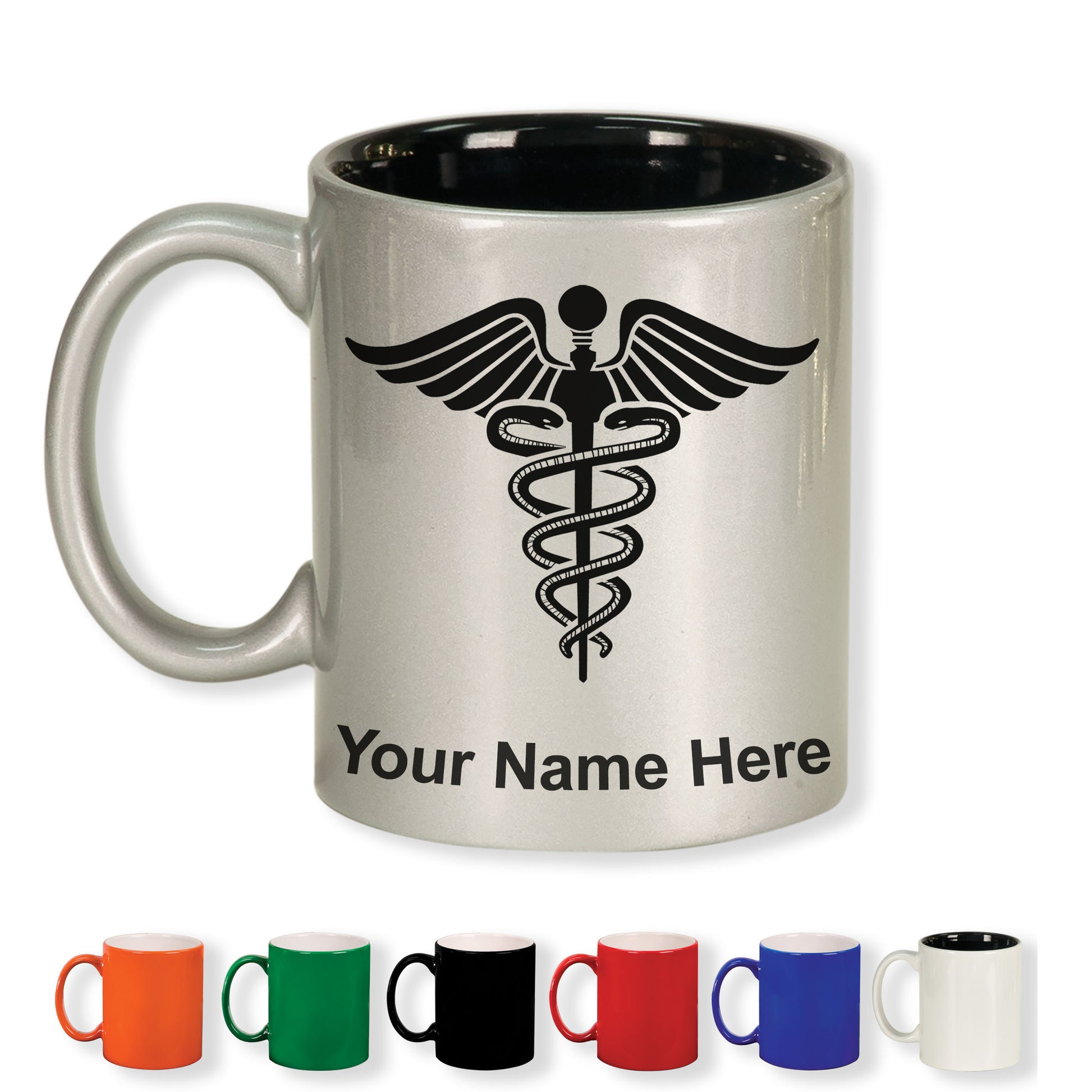 11oz Round Ceramic Coffee Mug, Caduceus Medical Symbol, Personalized Engraving Included