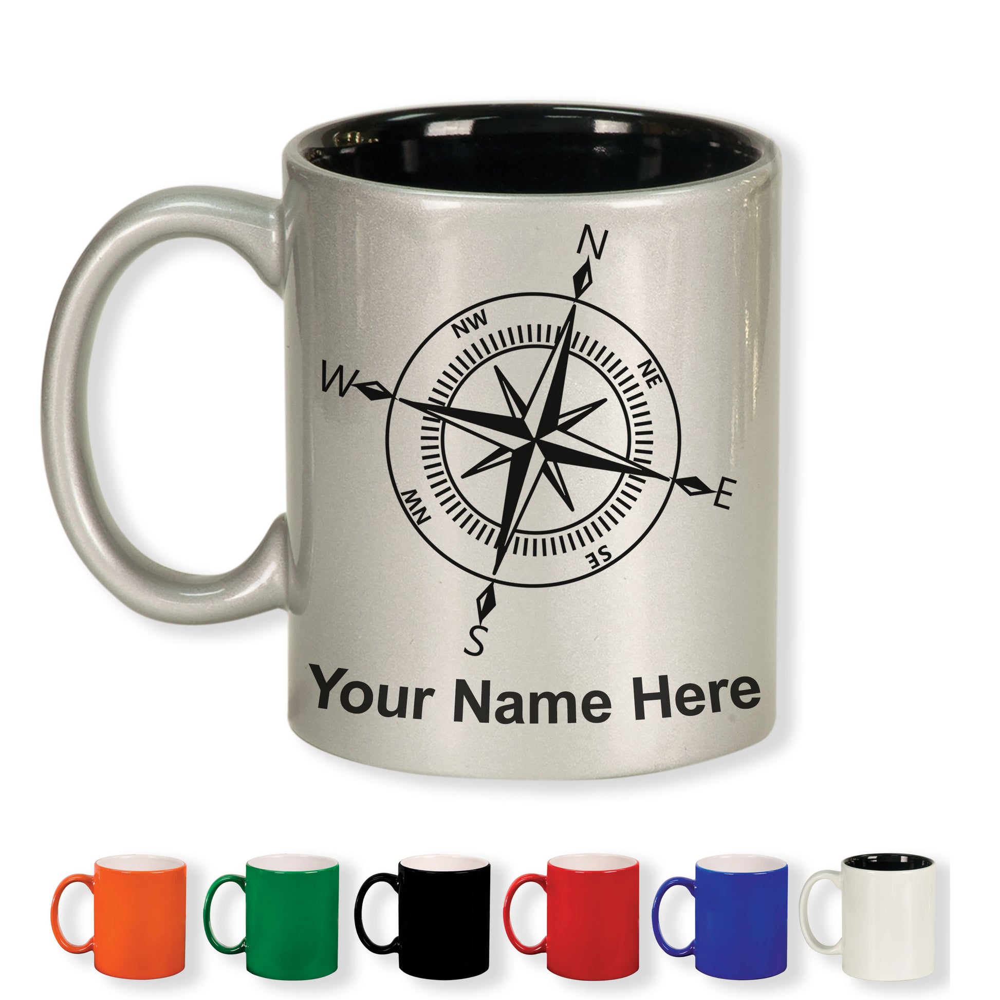 11oz Round Ceramic Coffee Mug, Compass Rose, Personalized Engraving Included