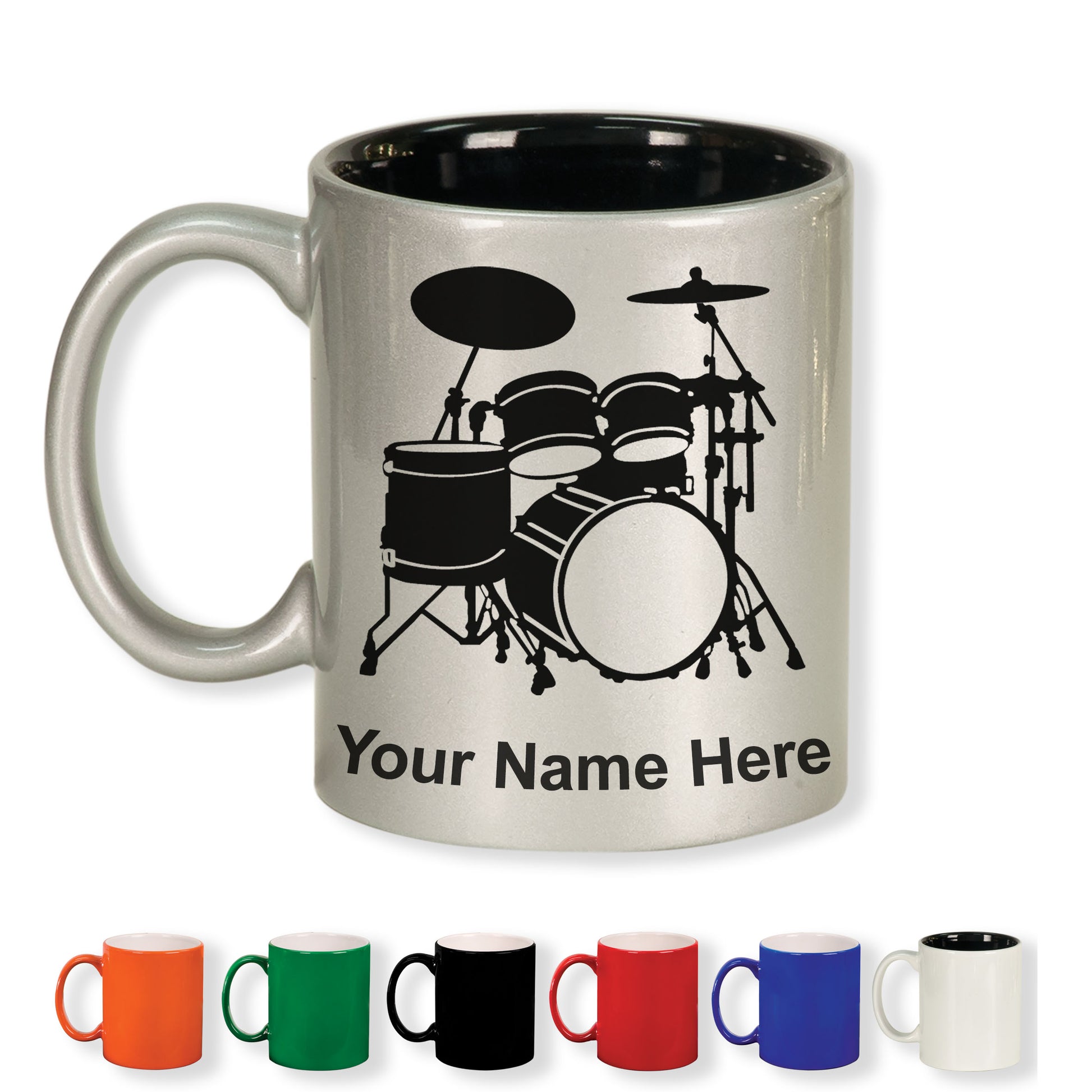 11oz Round Ceramic Coffee Mug, Drum Set, Personalized Engraving Included
