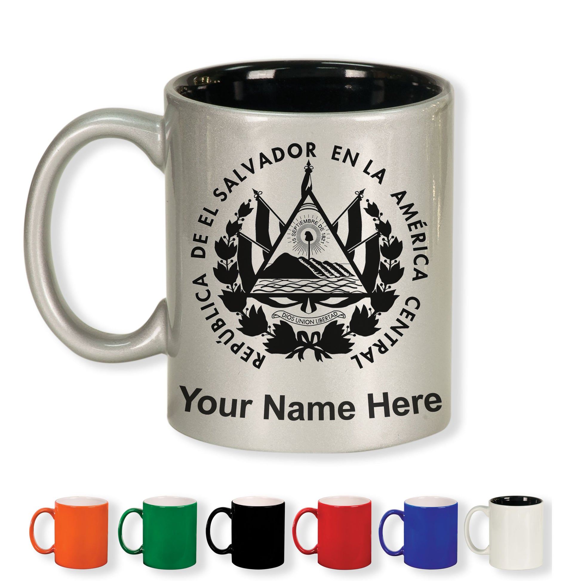 11oz Round Ceramic Coffee Mug, Flag of El Salvador, Personalized Engraving Included