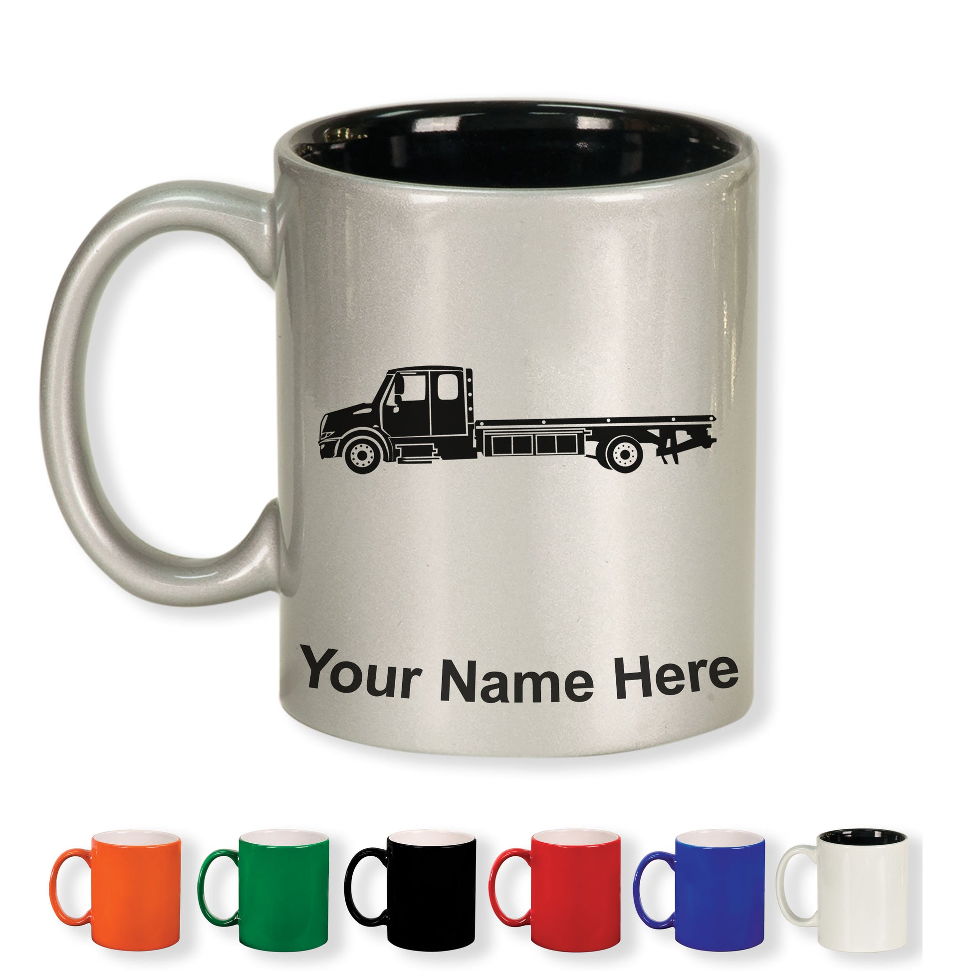 11oz Round Ceramic Coffee Mug, Flat Bed Tow Truck, Personalized Engraving Included