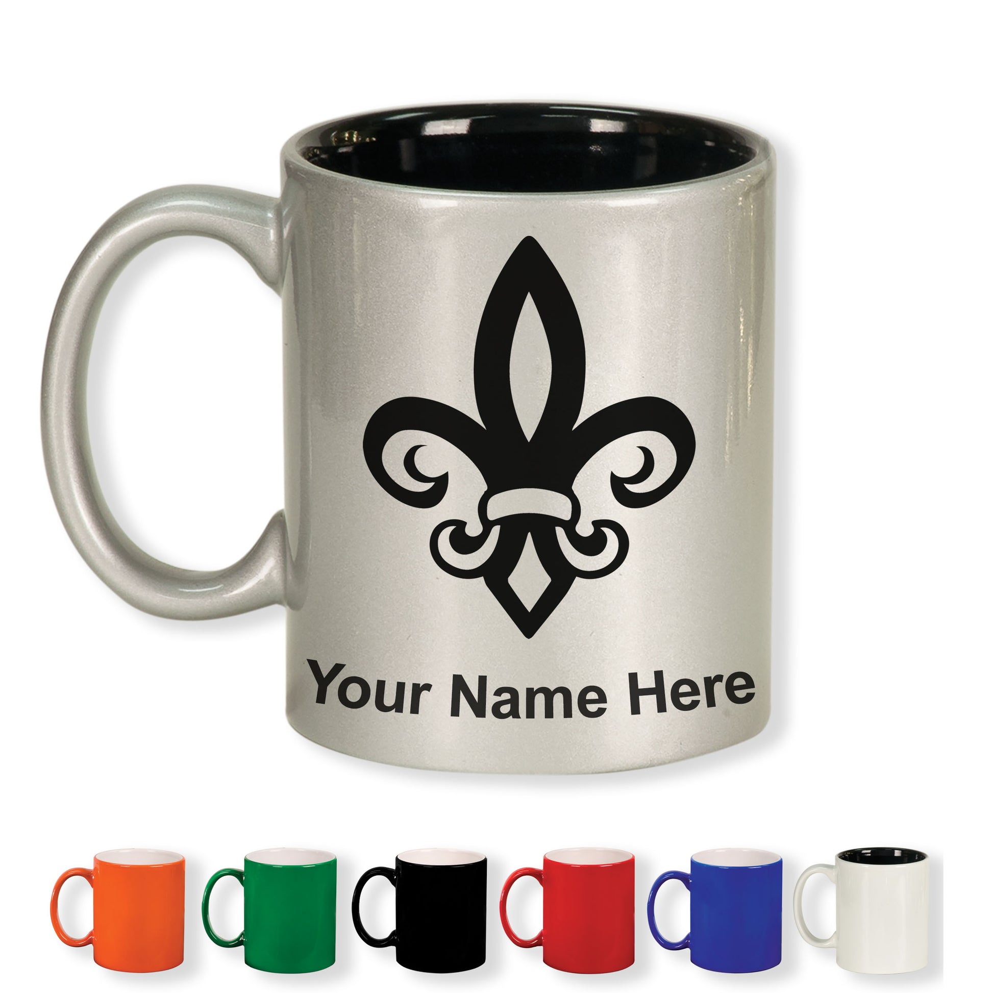 11oz Round Ceramic Coffee Mug, Fleur de Lis, Personalized Engraving Included