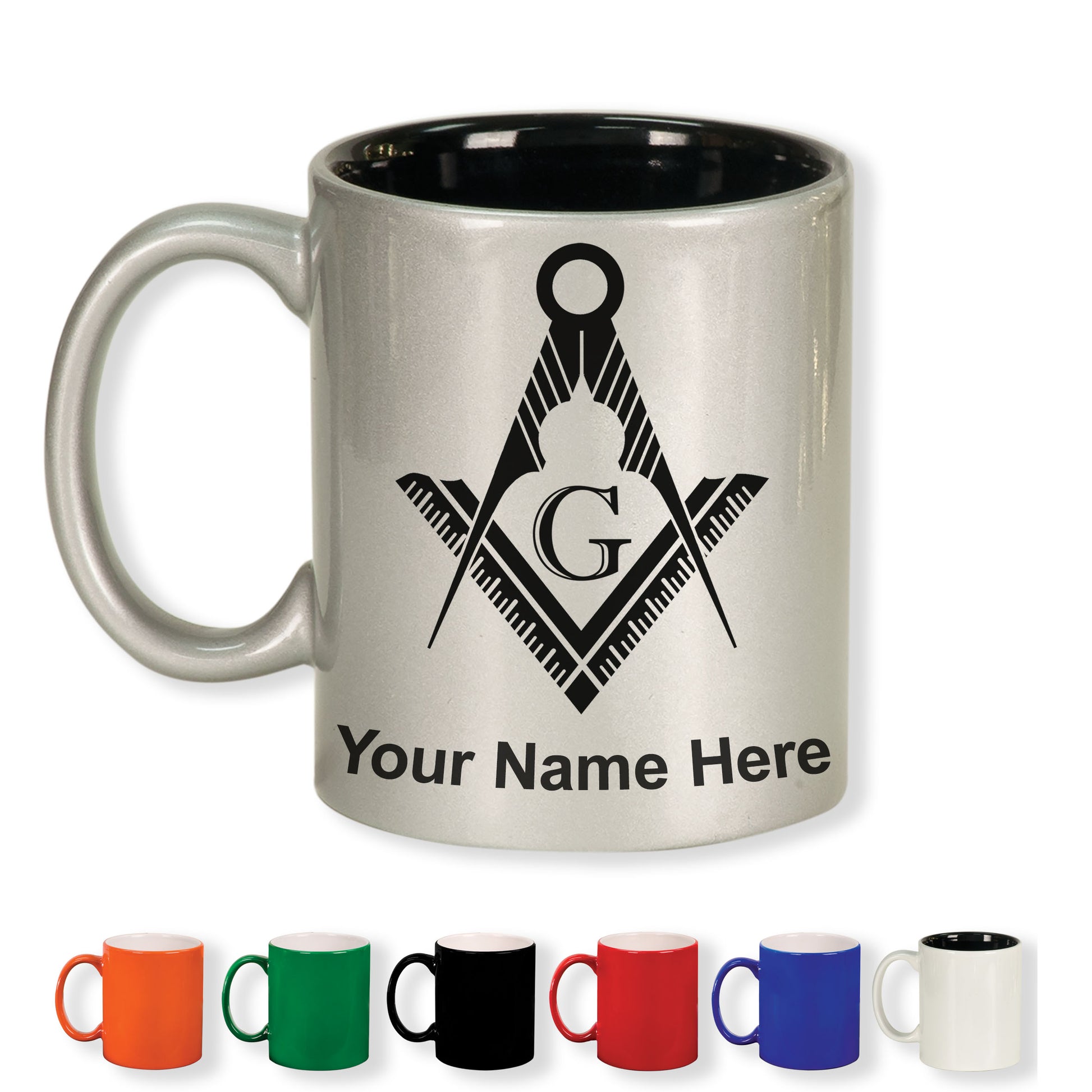 11oz Round Ceramic Coffee Mug, Freemason Symbol, Personalized Engraving Included