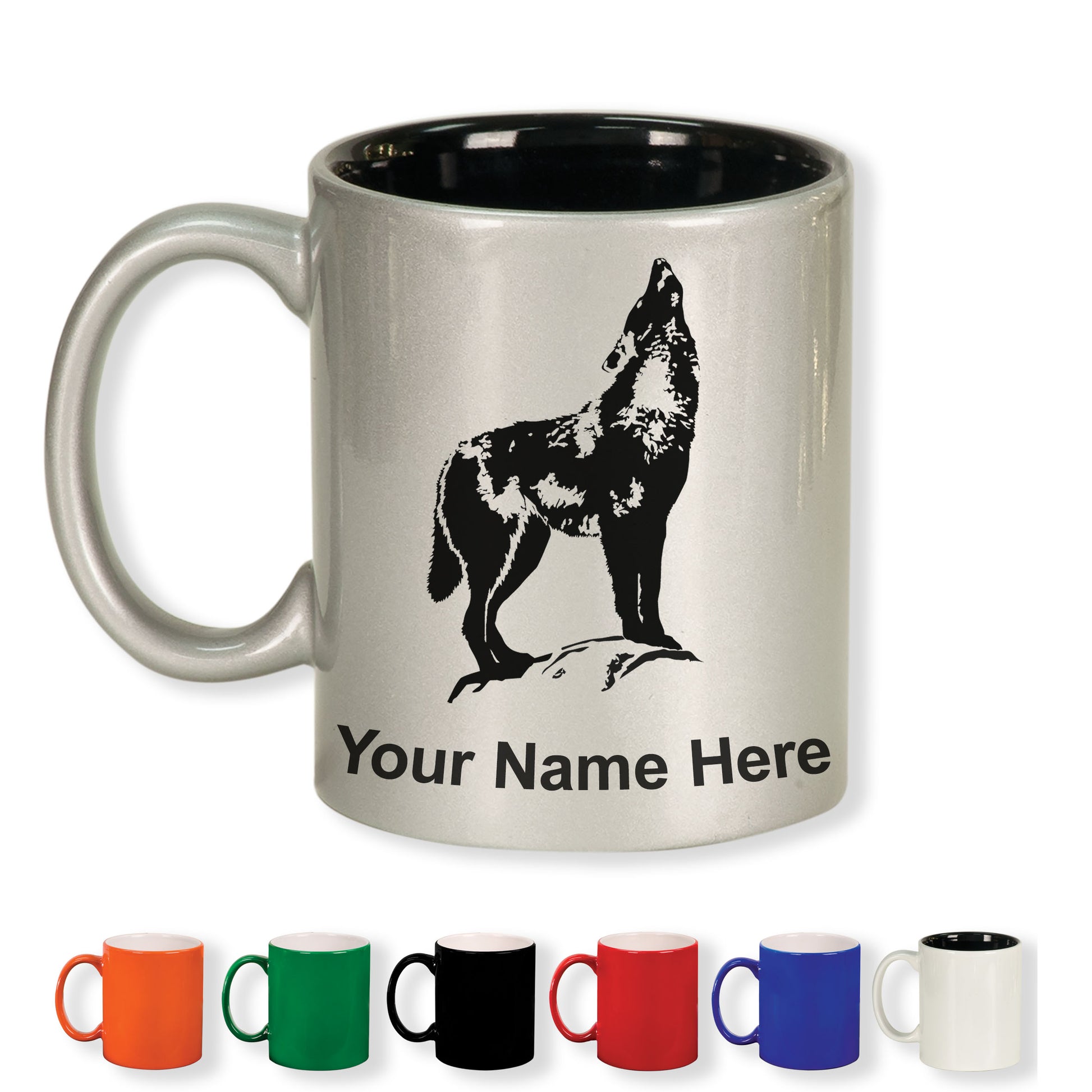 11oz Round Ceramic Coffee Mug, Howling Wolf, Personalized Engraving Included