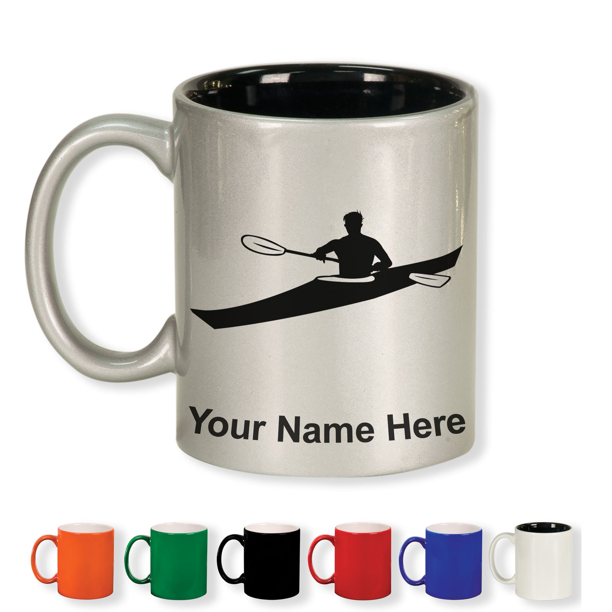 11oz Round Ceramic Coffee Mug, Kayak Man, Personalized Engraving Included