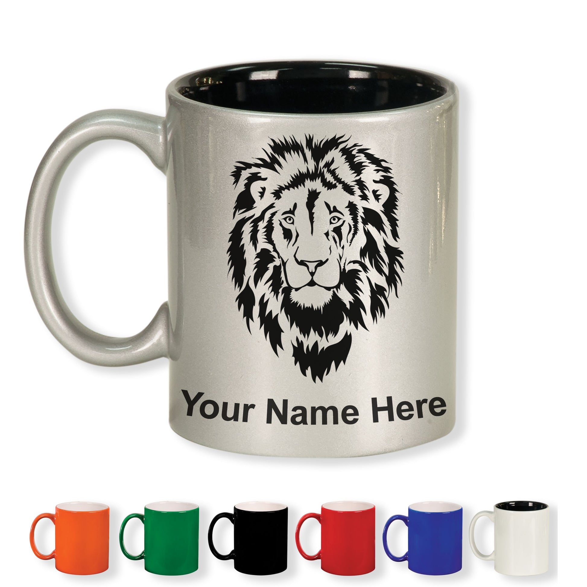 11oz Round Ceramic Coffee Mug, Lion Head, Personalized Engraving Included