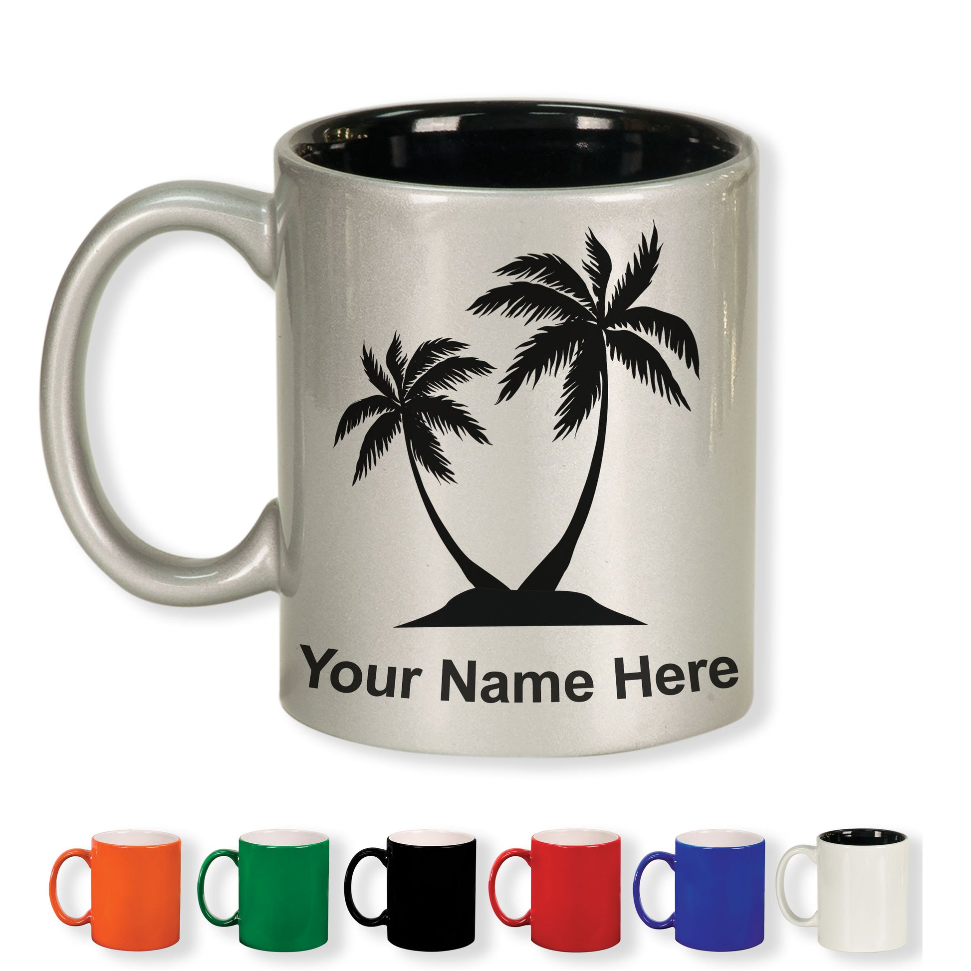 11oz Round Ceramic Coffee Mug, Palm Trees, Personalized Engraving Included