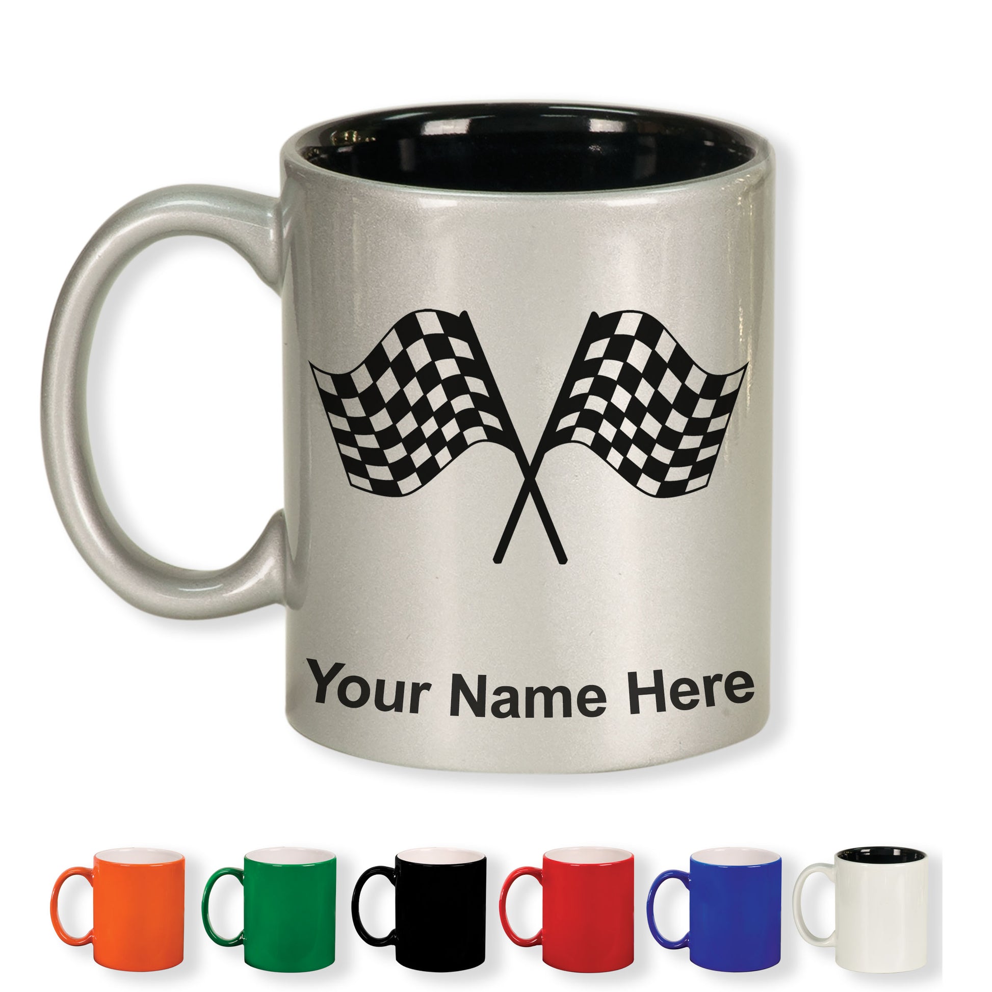 11oz Round Ceramic Coffee Mug, Racing Flags, Personalized Engraving Included