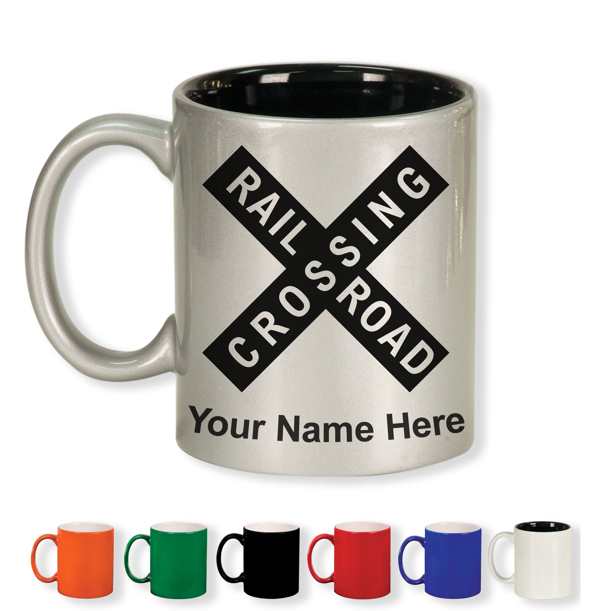 11oz Round Ceramic Coffee Mug, Railroad Crossing Sign 1, Personalized Engraving Included