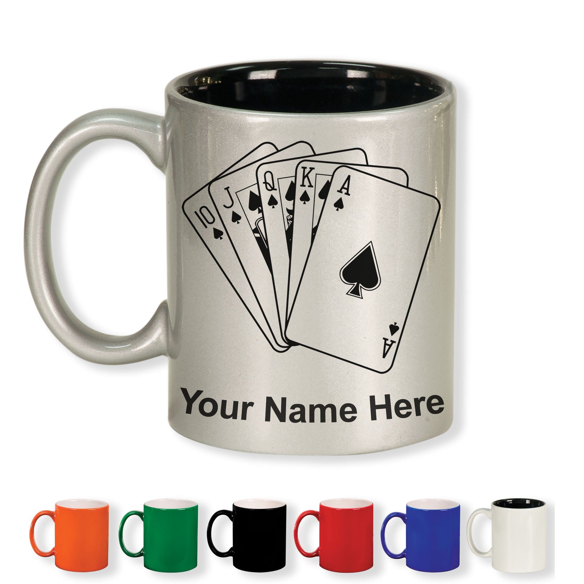 11oz Round Ceramic Coffee Mug, Royal Flush Poker Cards, Personalized Engraving Included
