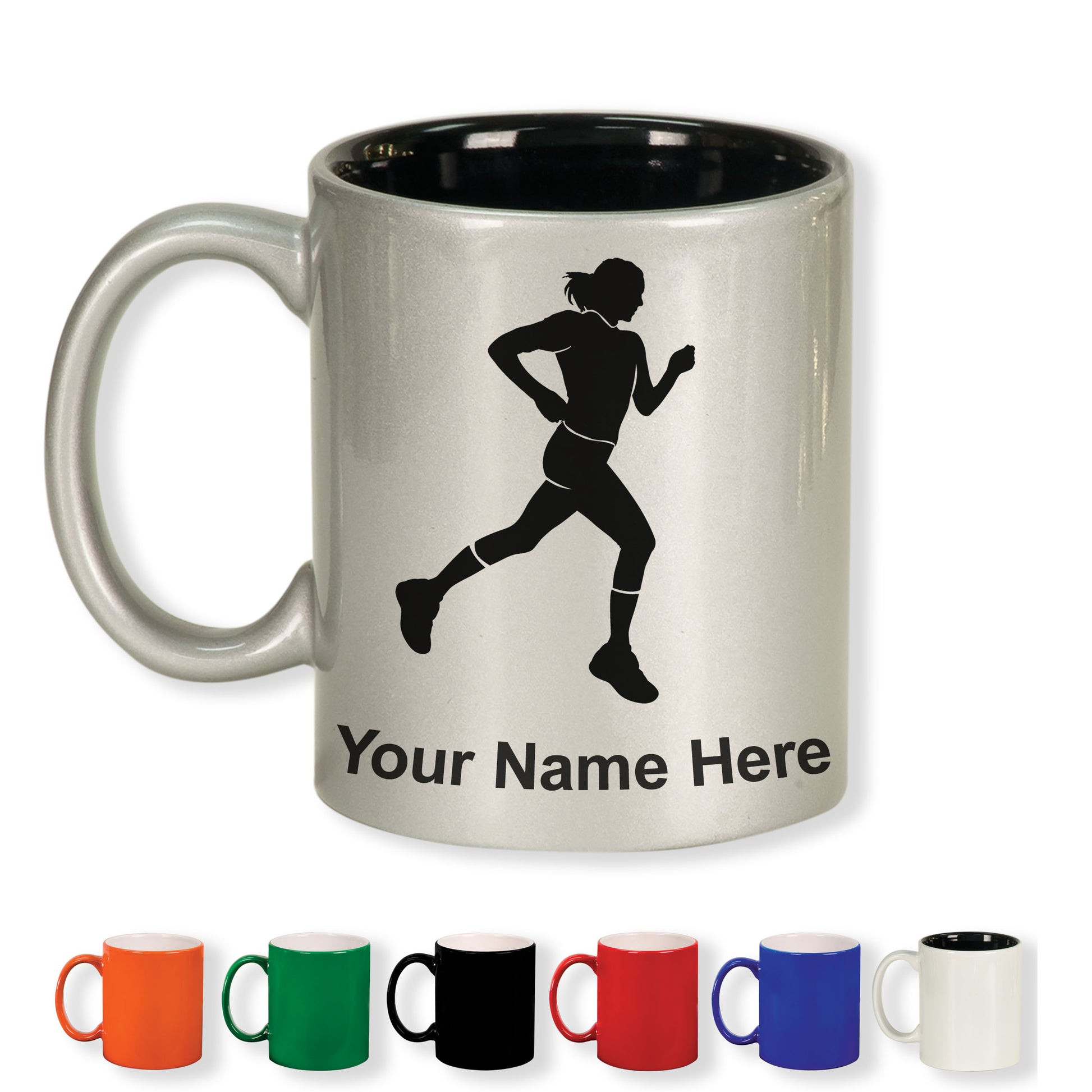11oz Round Ceramic Coffee Mug, Running Woman, Personalized Engraving Included