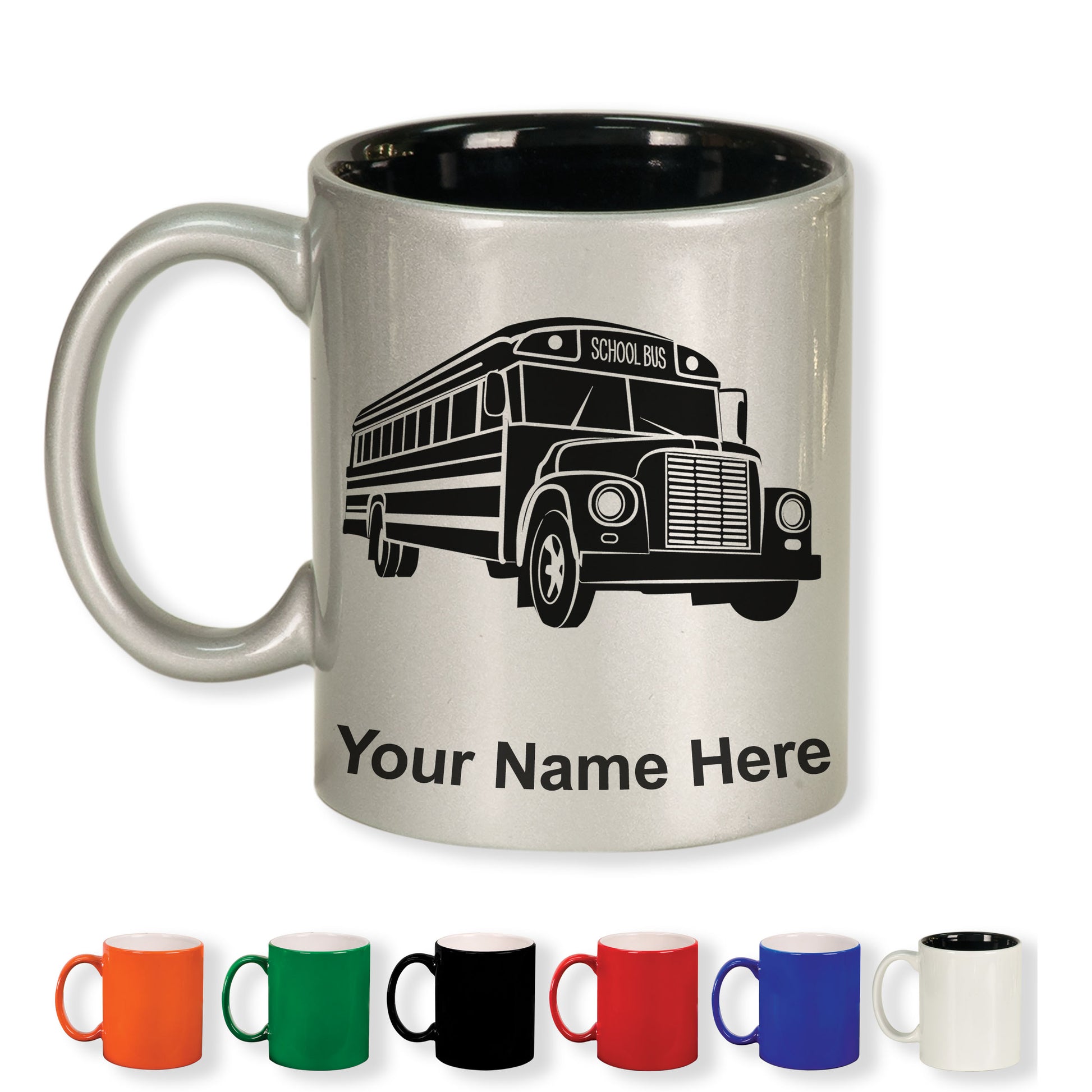11oz Round Ceramic Coffee Mug, School Bus, Personalized Engraving Included