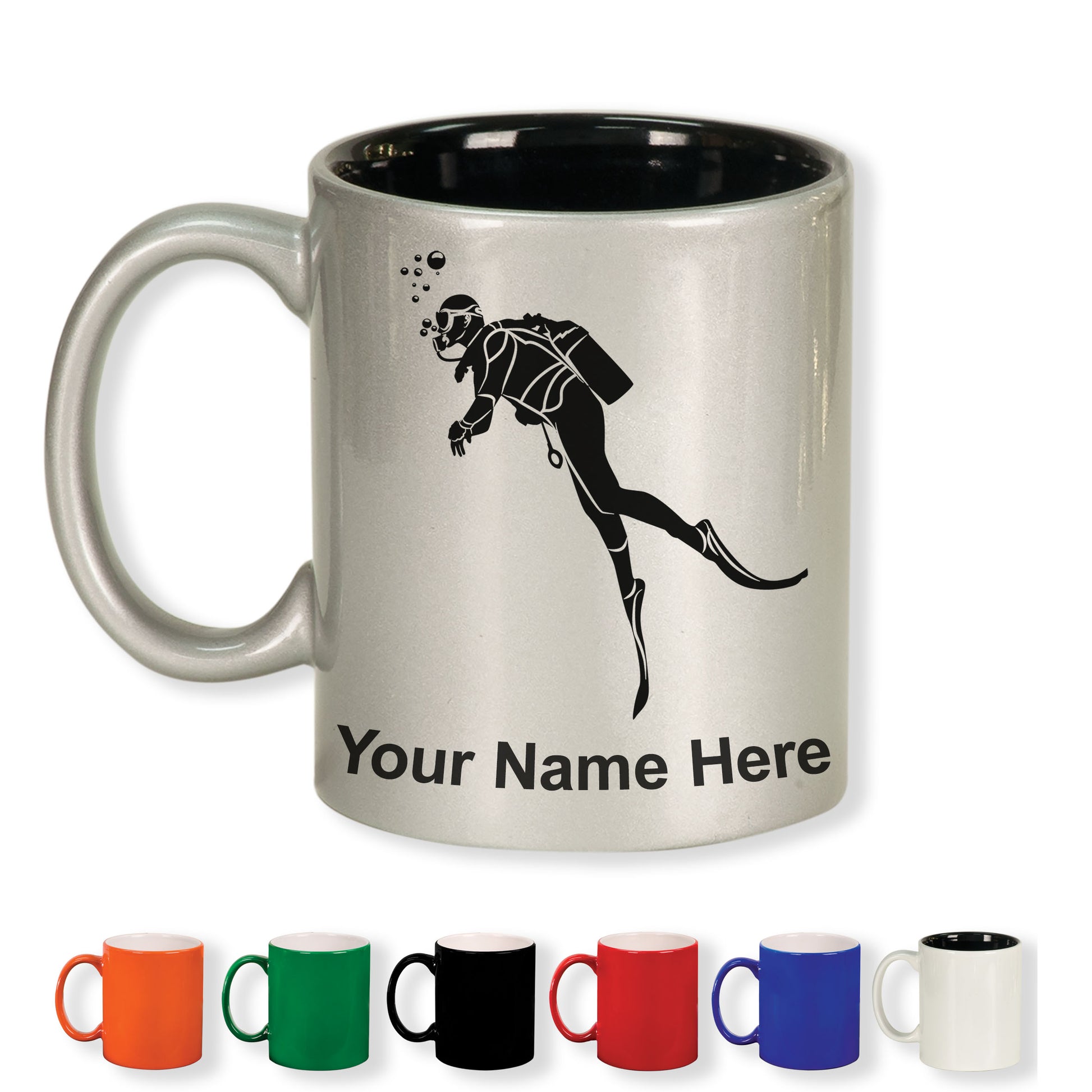 11oz Round Ceramic Coffee Mug, Scuba Diver, Personalized Engraving Included