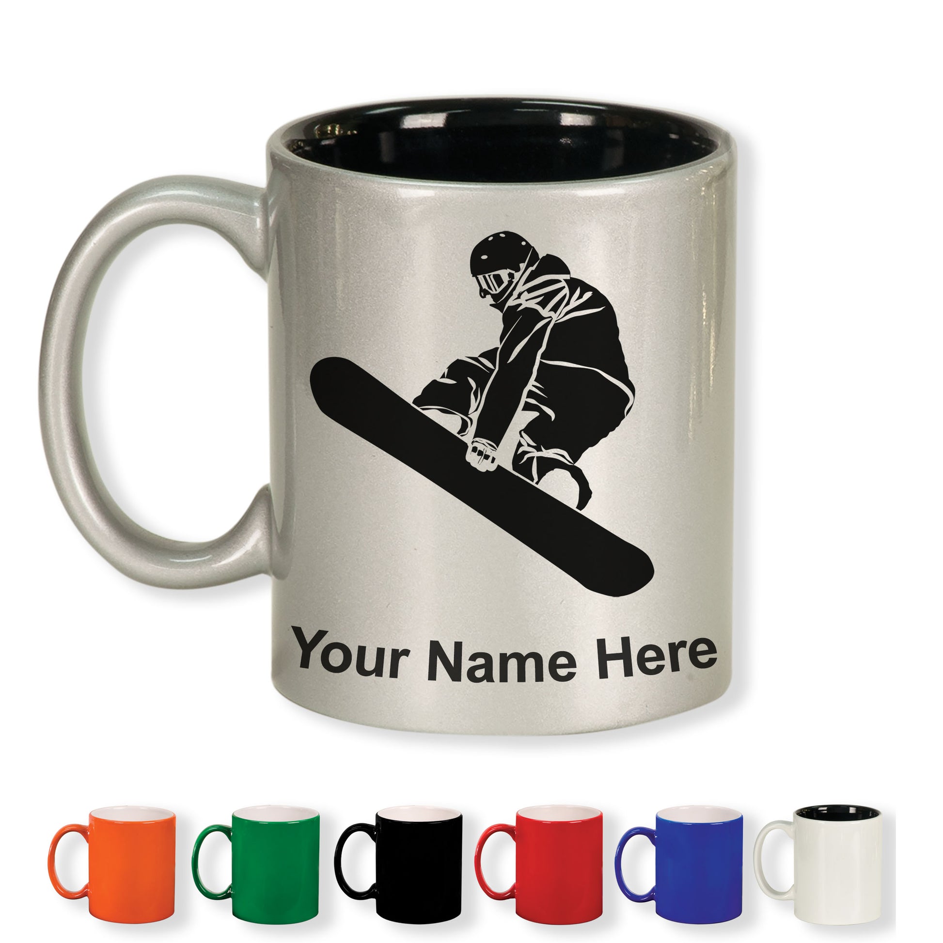 11oz Round Ceramic Coffee Mug, Snowboarder Man, Personalized Engraving Included