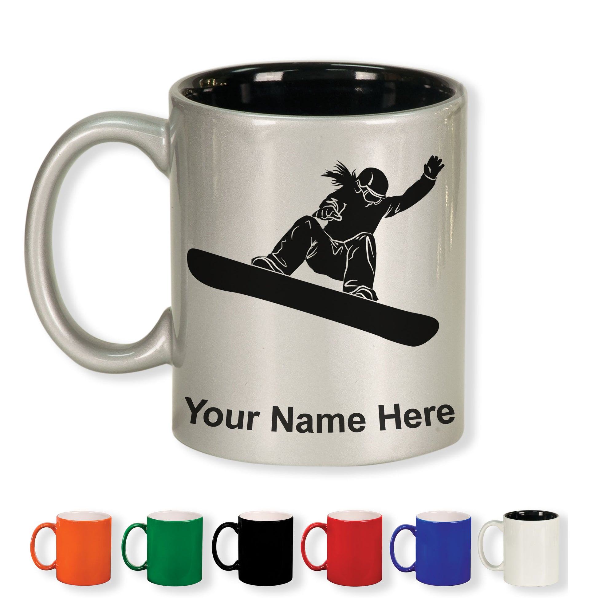 11oz Round Ceramic Coffee Mug, Snowboarder Woman, Personalized Engraving Included