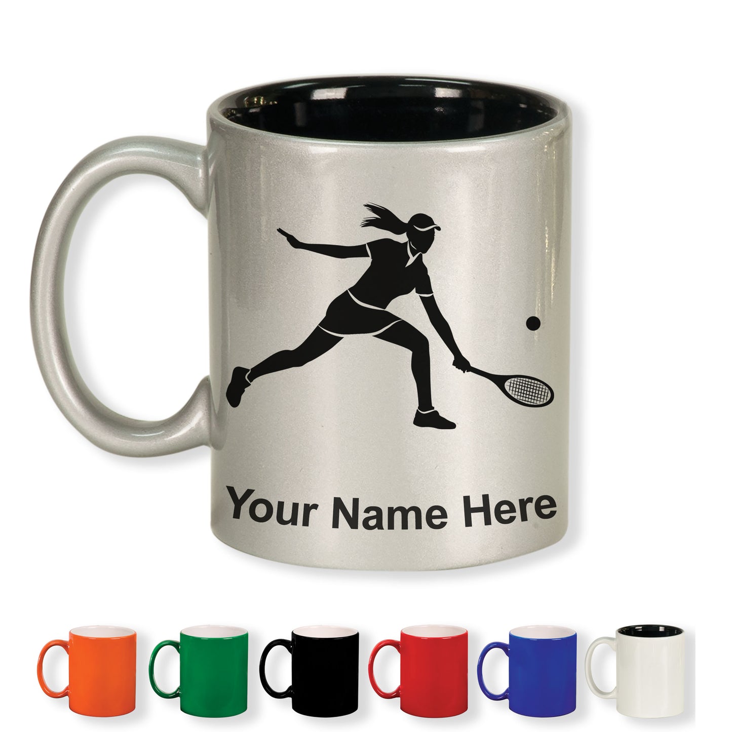 11oz Round Ceramic Coffee Mug, Tennis Player Woman, Personalized Engraving Included