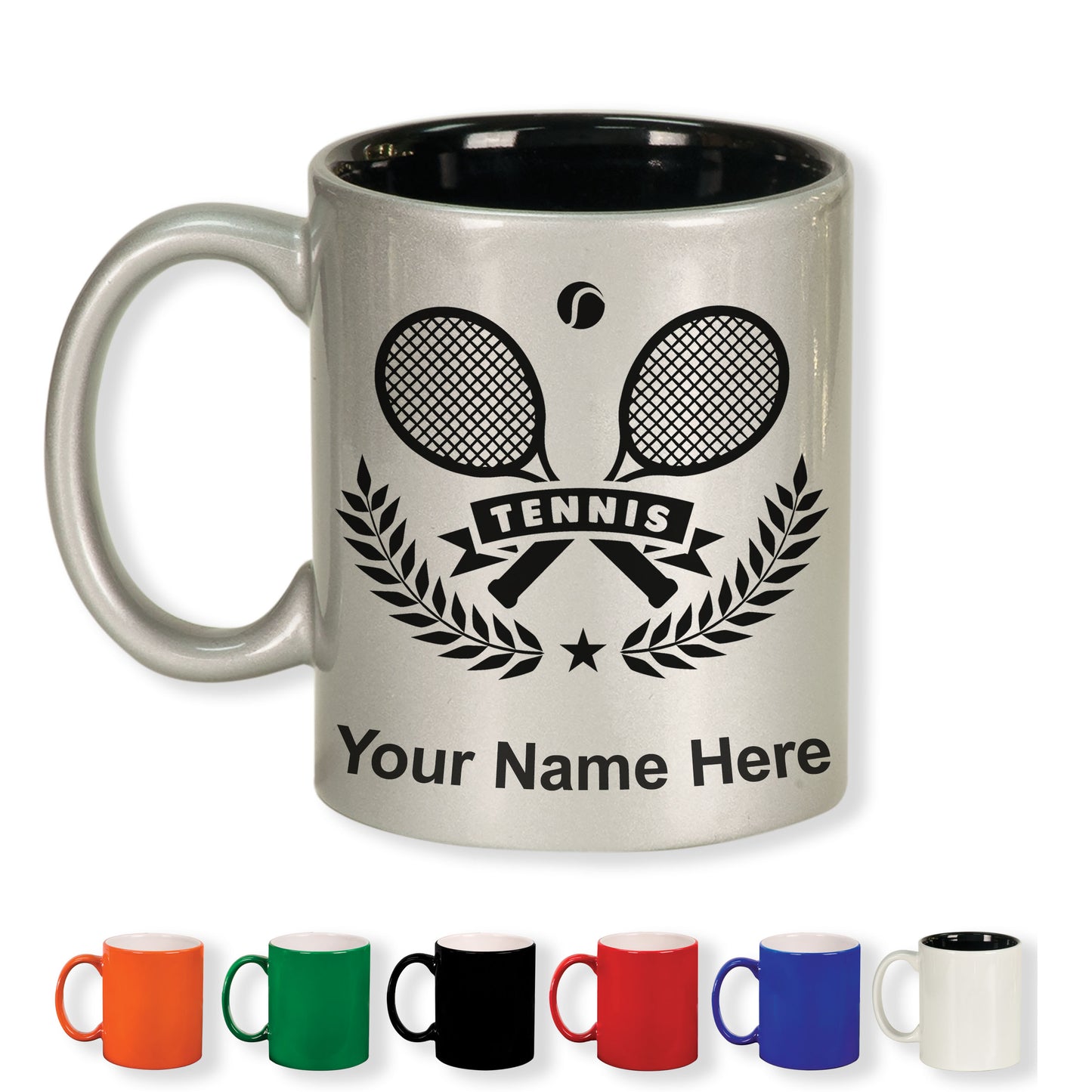 11oz Round Ceramic Coffee Mug, Tennis Rackets, Personalized Engraving Included