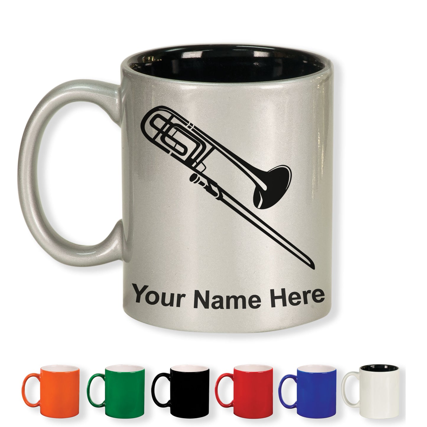 11oz Round Ceramic Coffee Mug, Trombone, Personalized Engraving Included