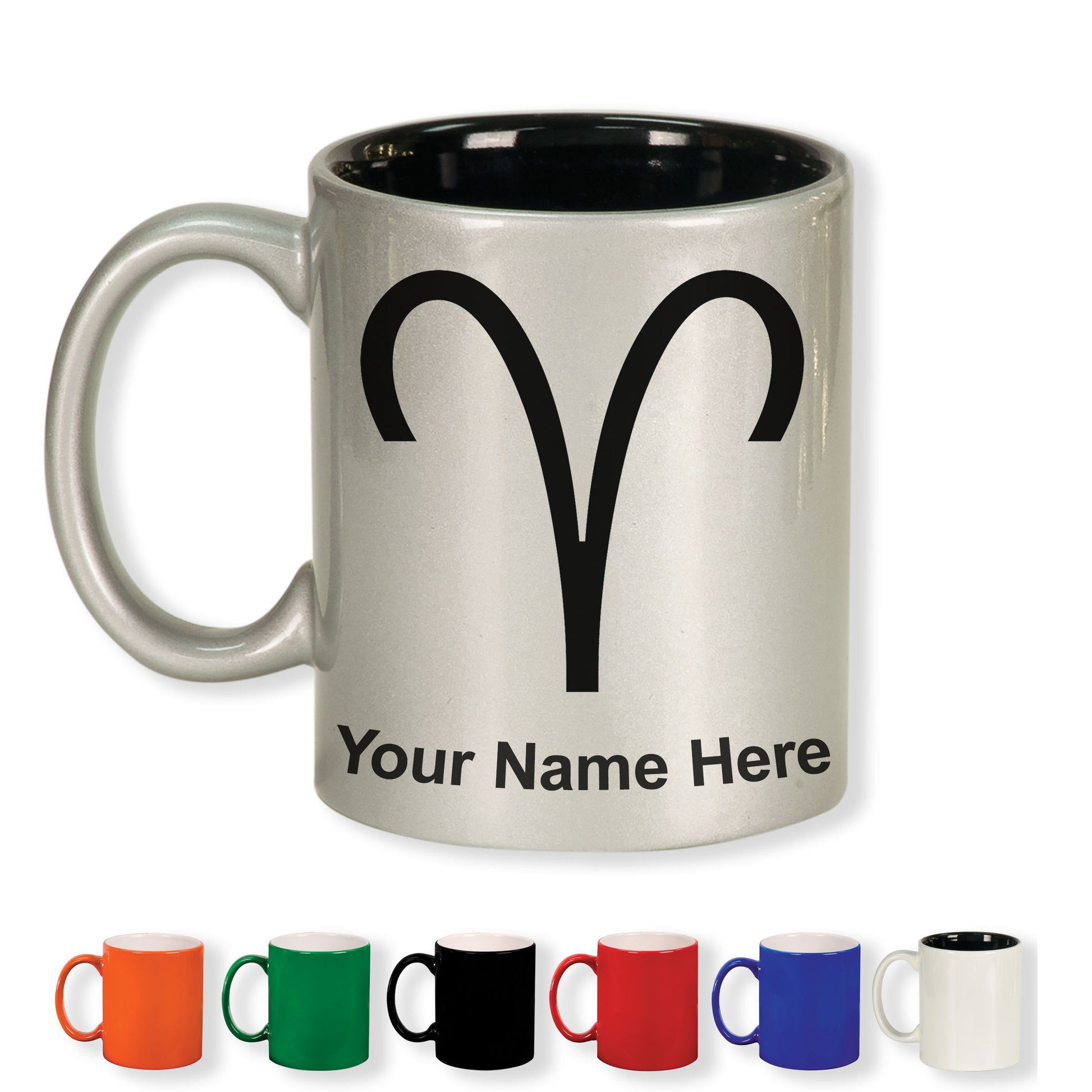 11oz Round Ceramic Coffee Mug, Zodiac Sign Aries, Personalized Engraving Included