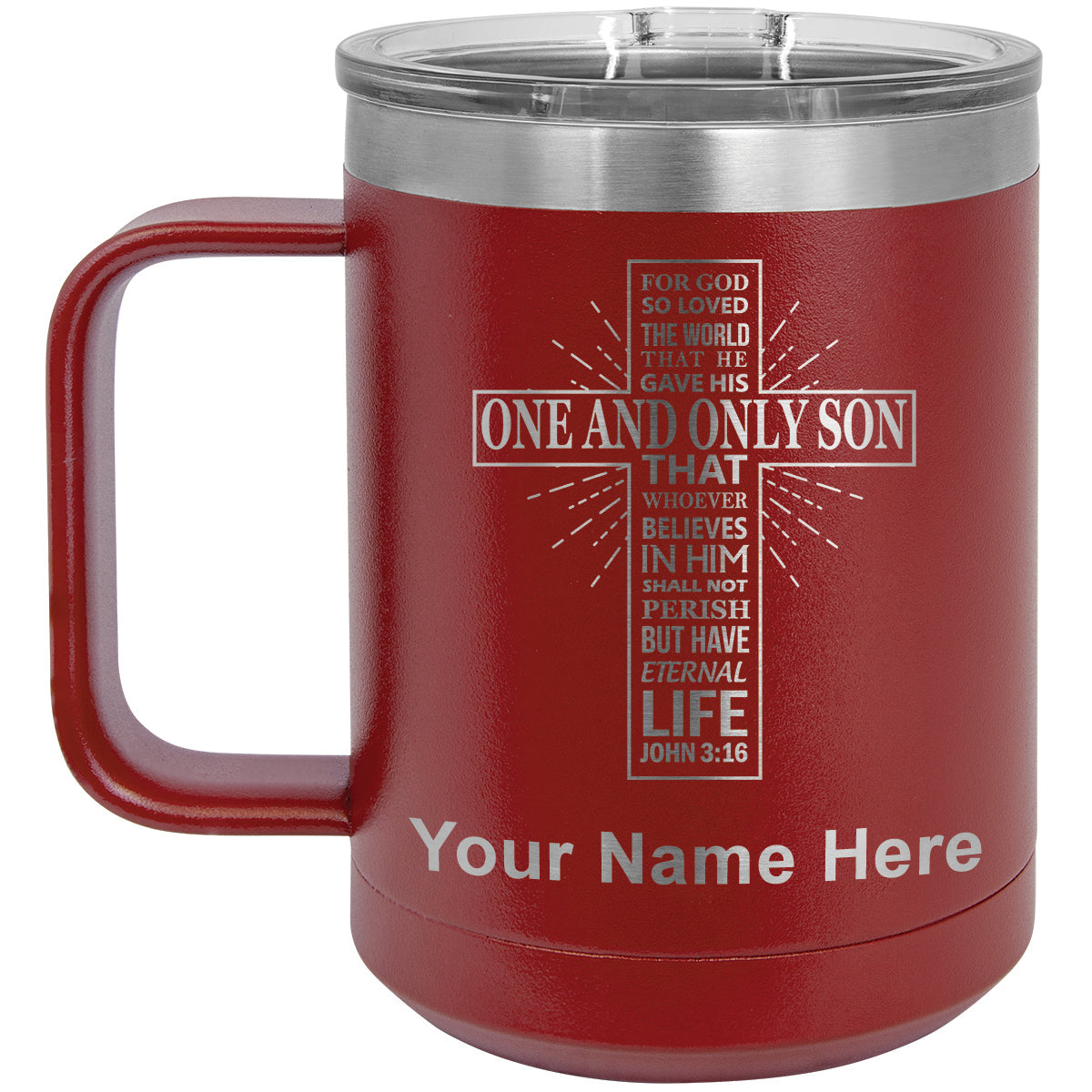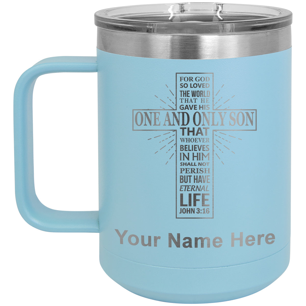15oz Vacuum Insulated Coffee Mug, Bible Verse John 3-16, Personalized Engraving Included