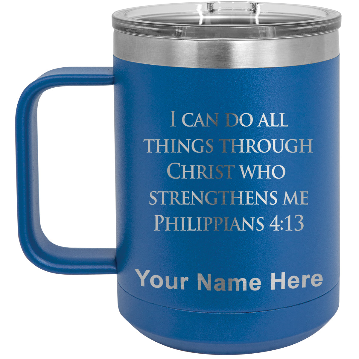 15oz Vacuum Insulated Coffee Mug, Bible Verse Philippians 4-13, Personalized Engraving Included