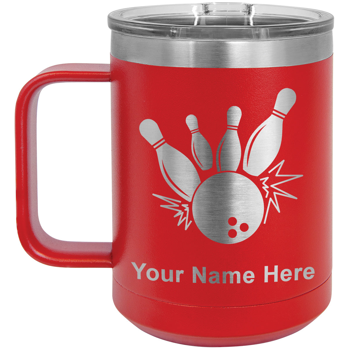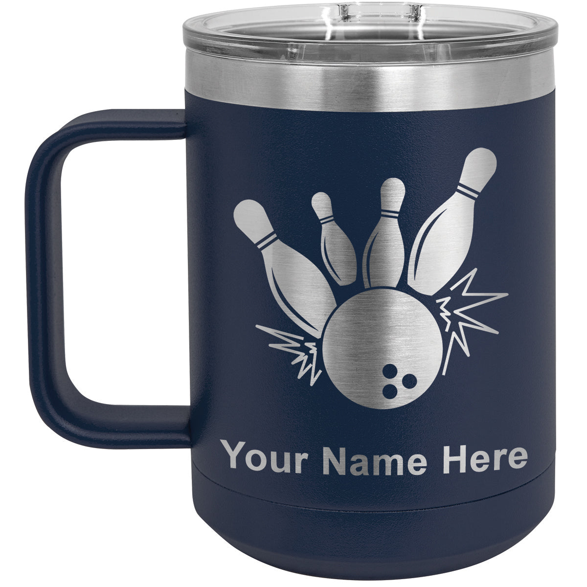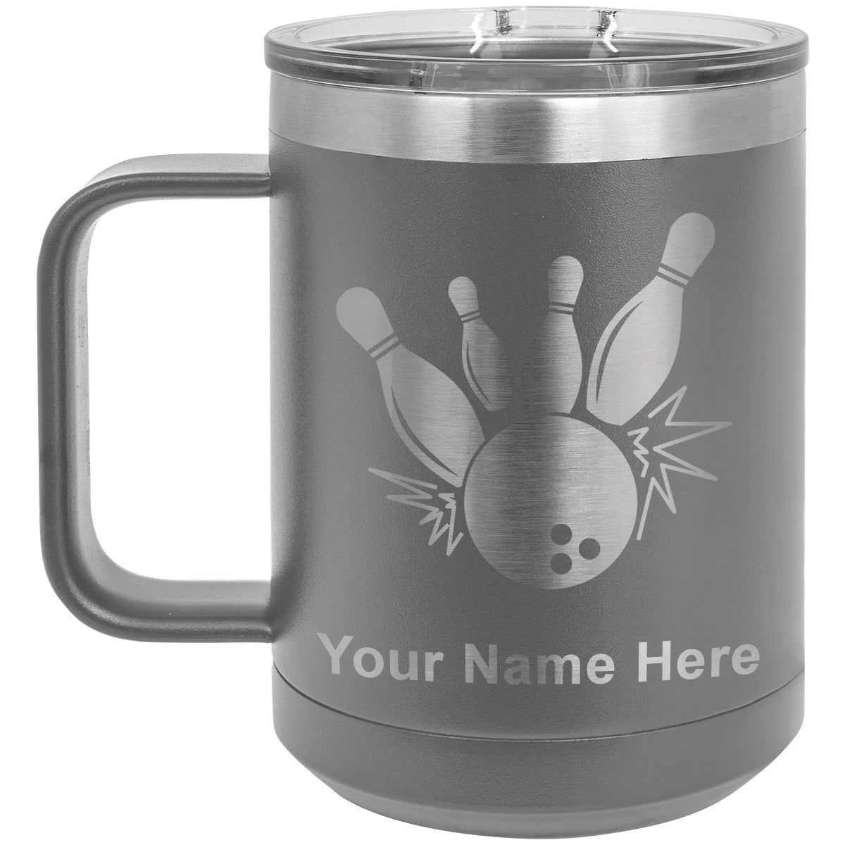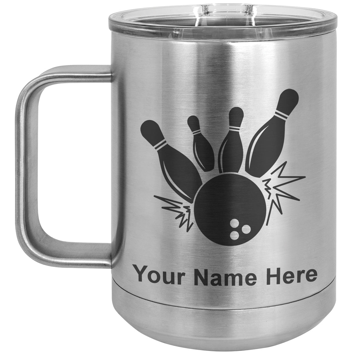 15oz Vacuum Insulated Coffee Mug, Bowling Ball and Pins, Personalized Engraving Included
