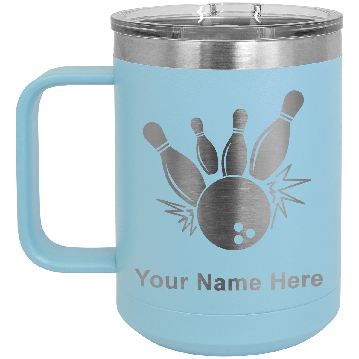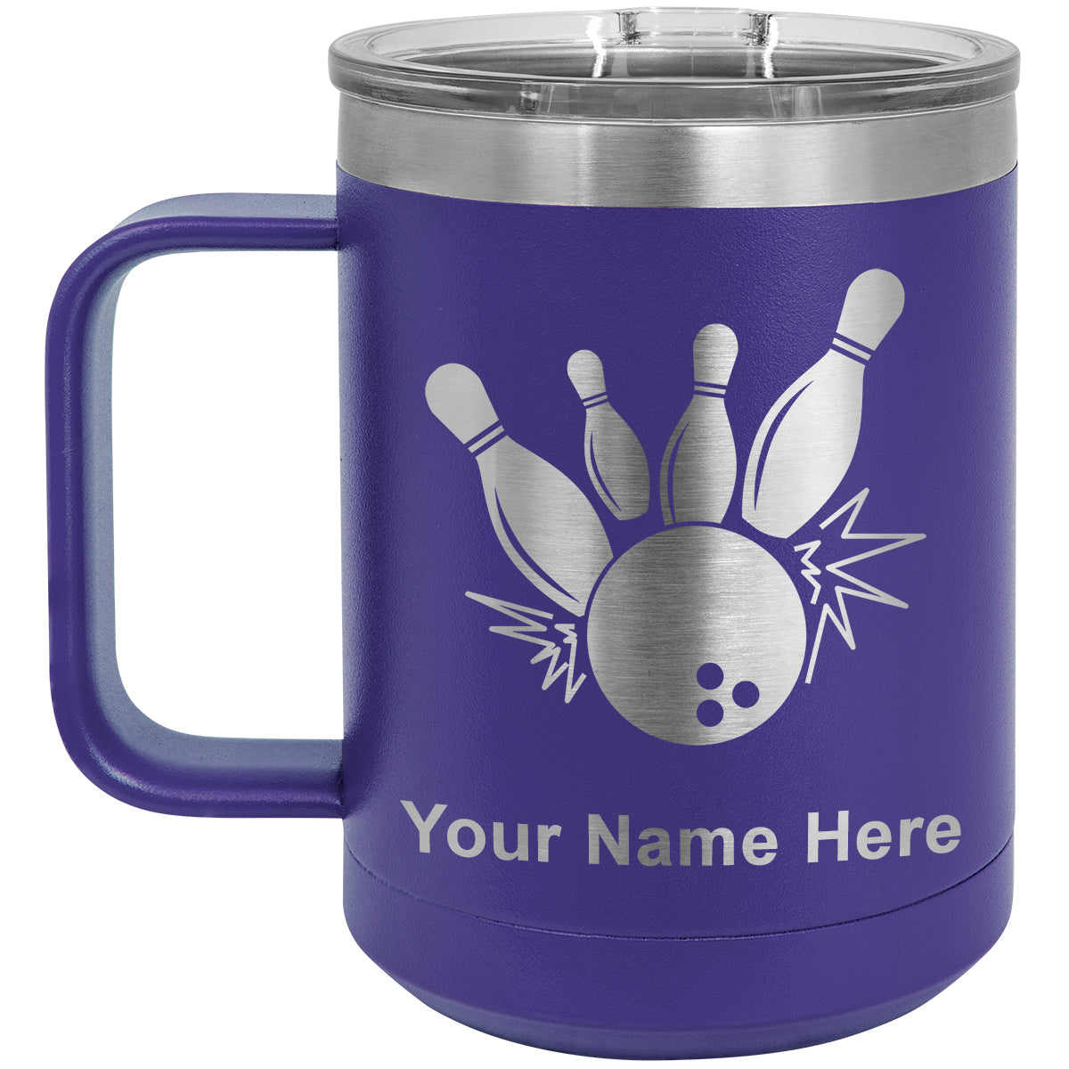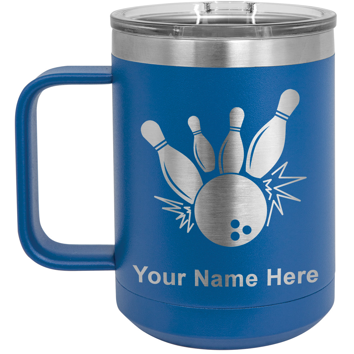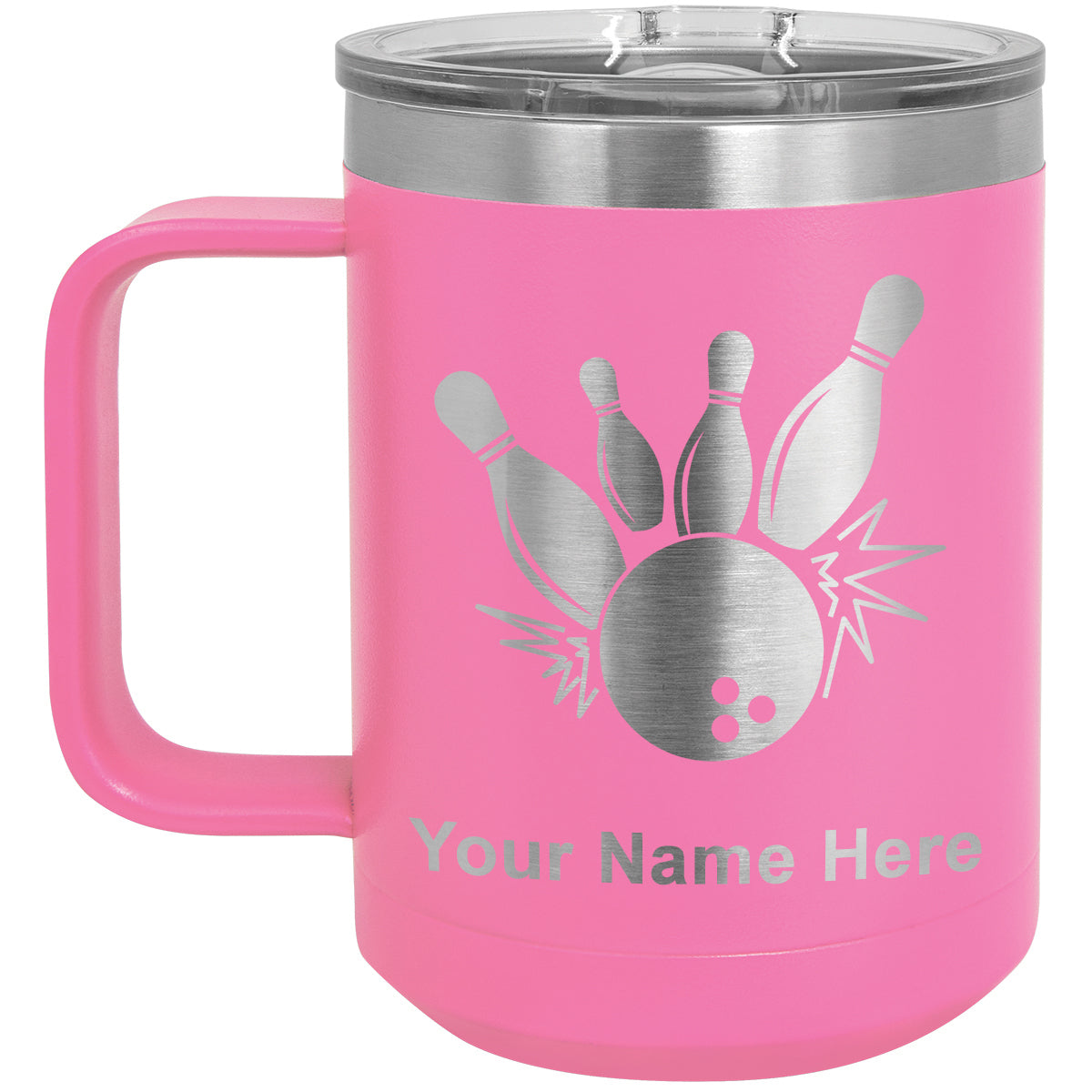 15oz Vacuum Insulated Coffee Mug, Bowling Ball and Pins, Personalized Engraving Included