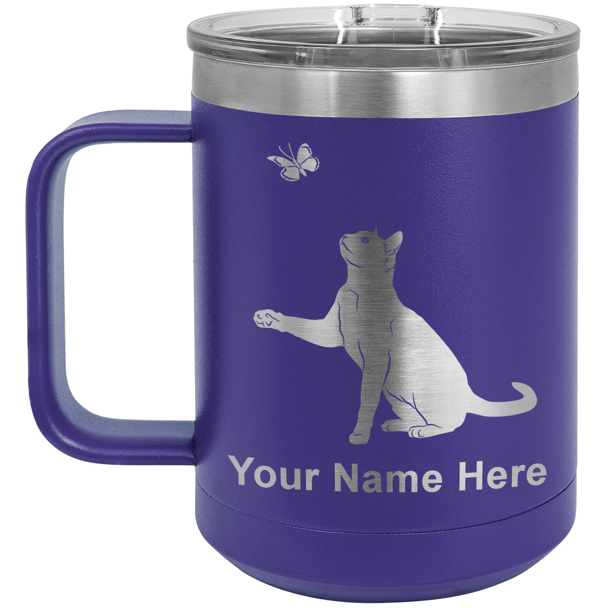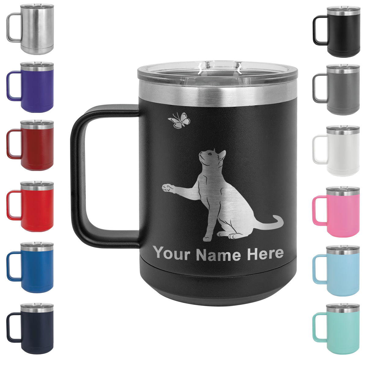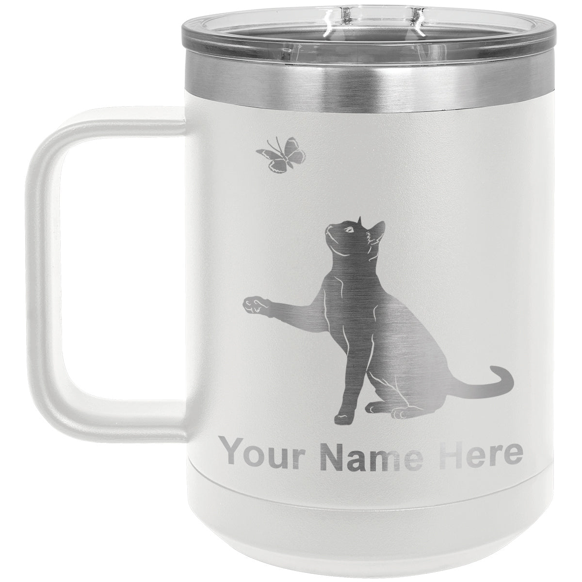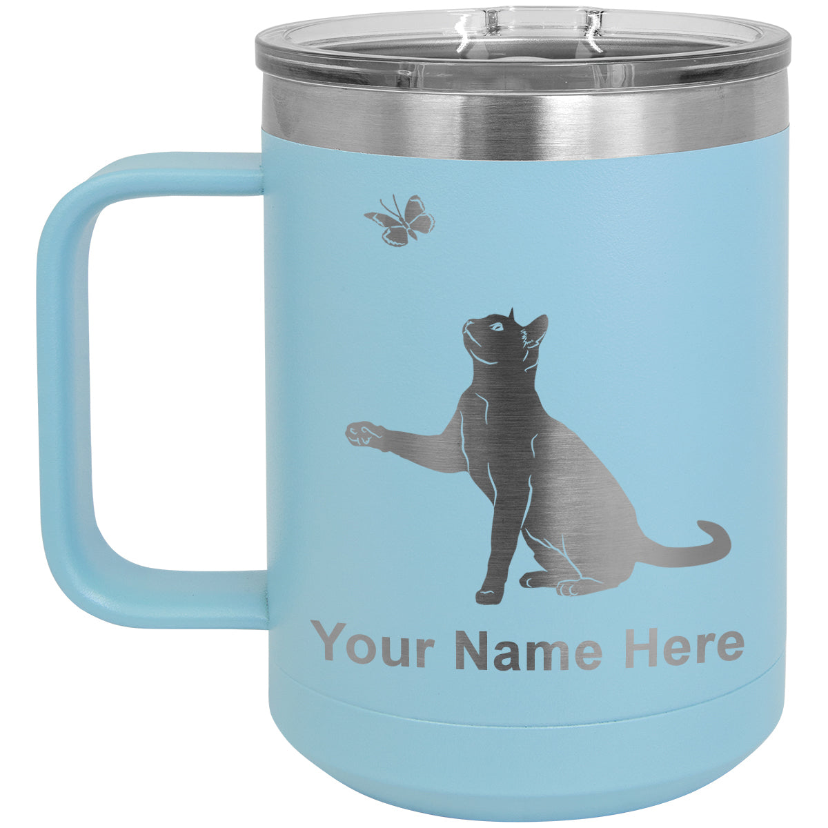 15oz Vacuum Insulated Coffee Mug, Cat with Butterfly, Personalized Engraving Included