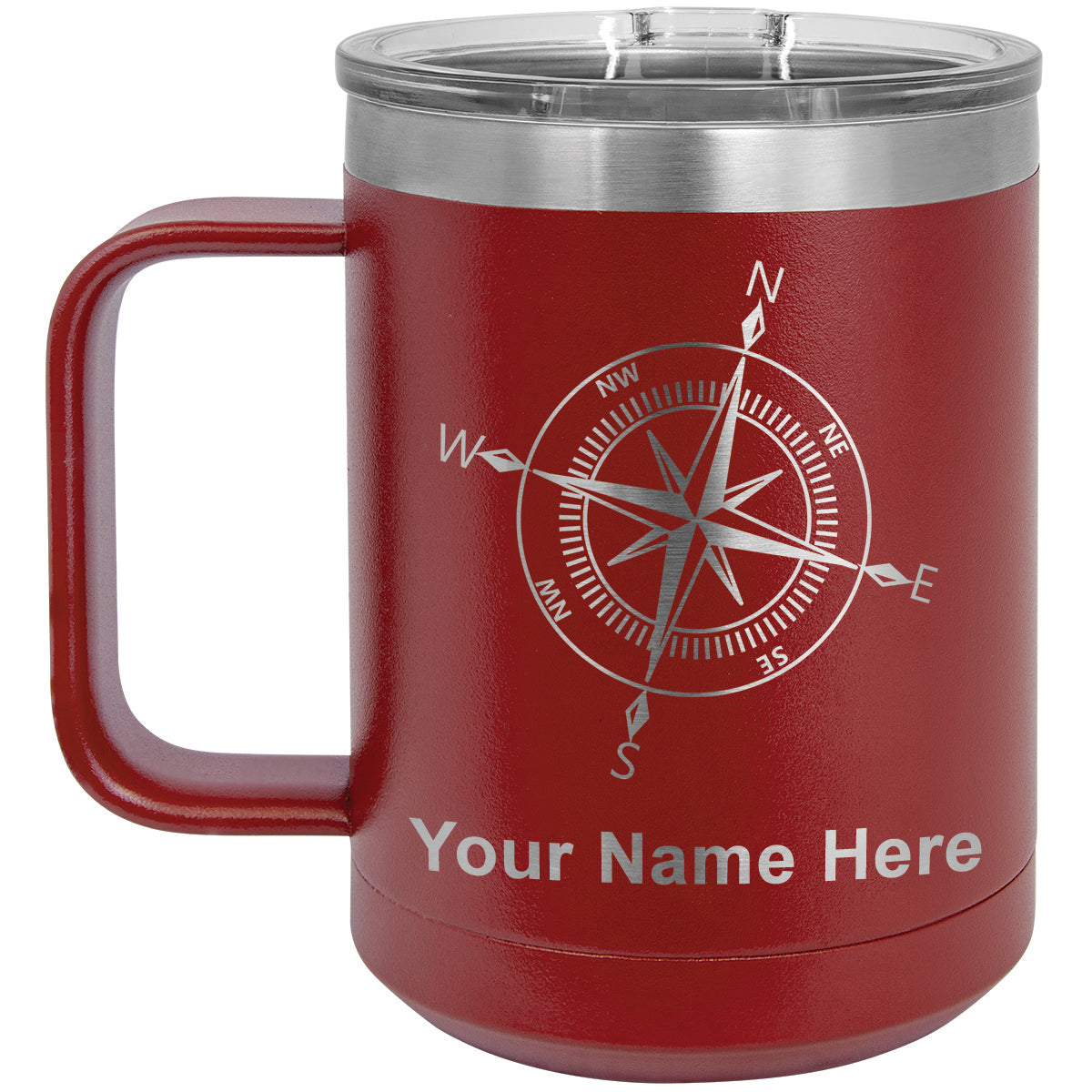 15oz Vacuum Insulated Coffee Mug, Compass Rose, Personalized Engraving Included