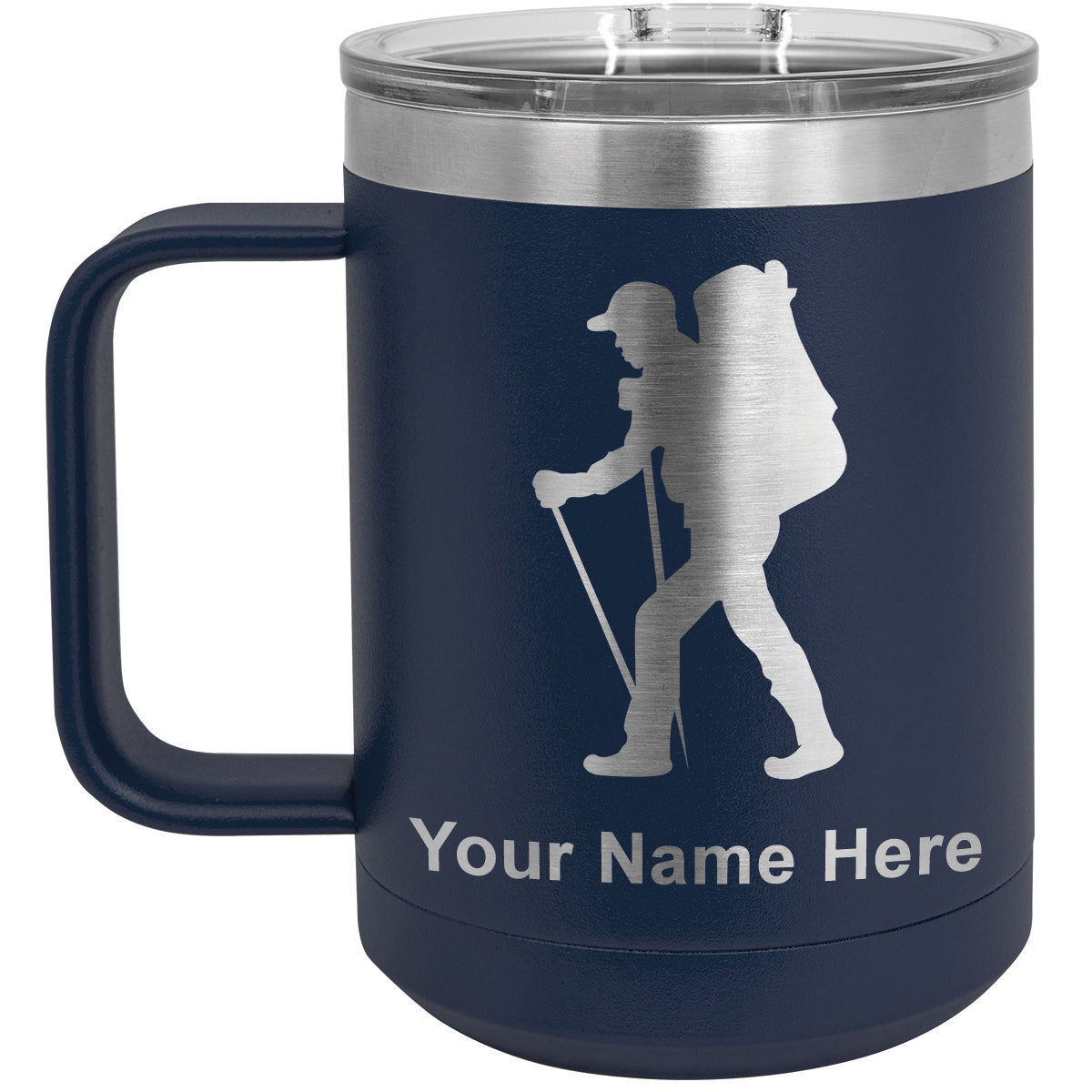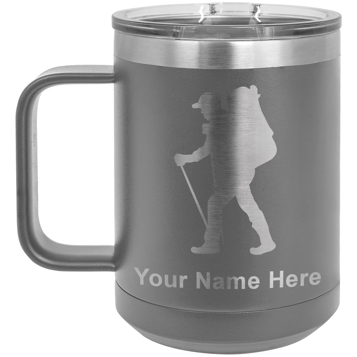 15oz Vacuum Insulated Coffee Mug, Hiker Man, Personalized Engraving Included