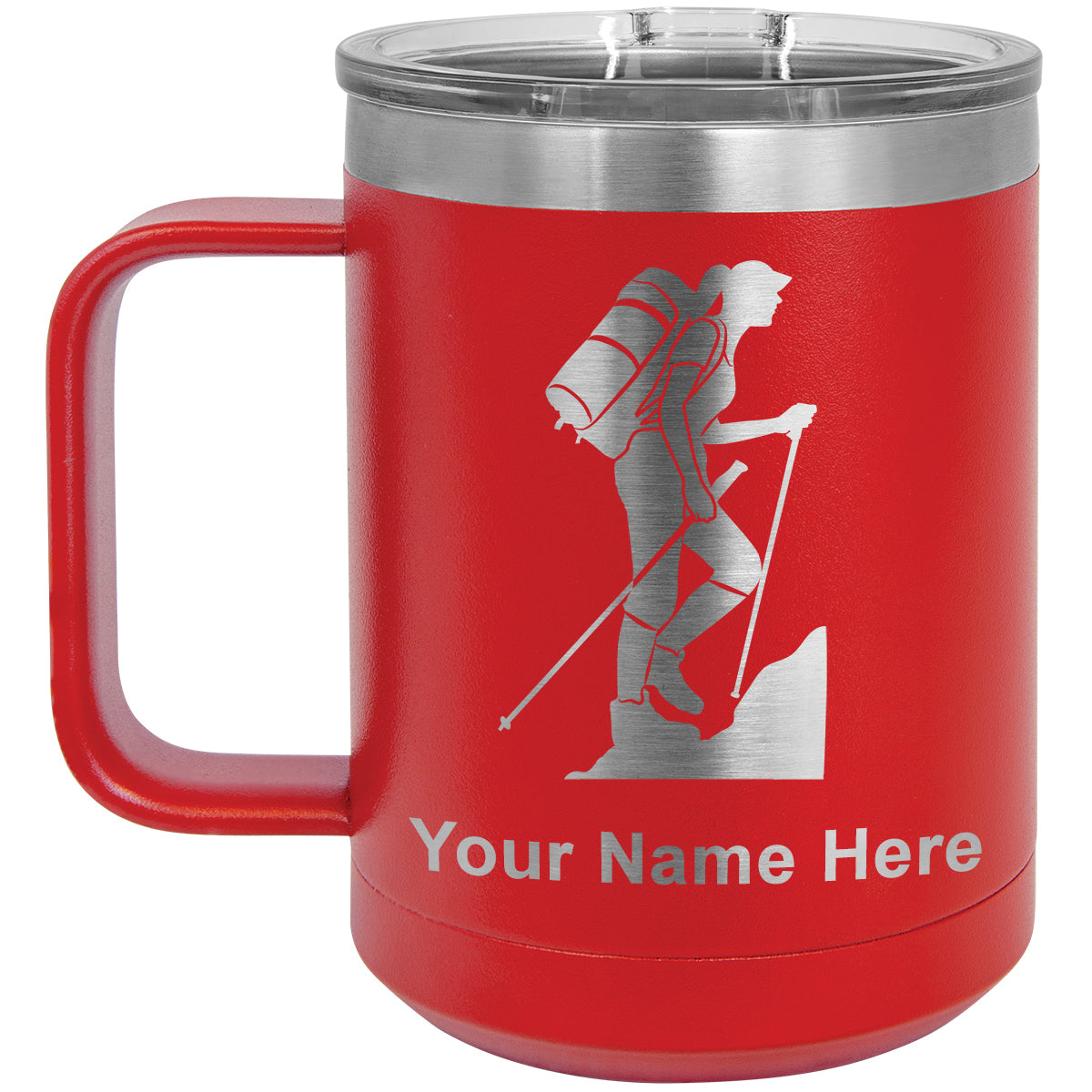 15oz Vacuum Insulated Coffee Mug, Hiker Woman, Personalized Engraving Included