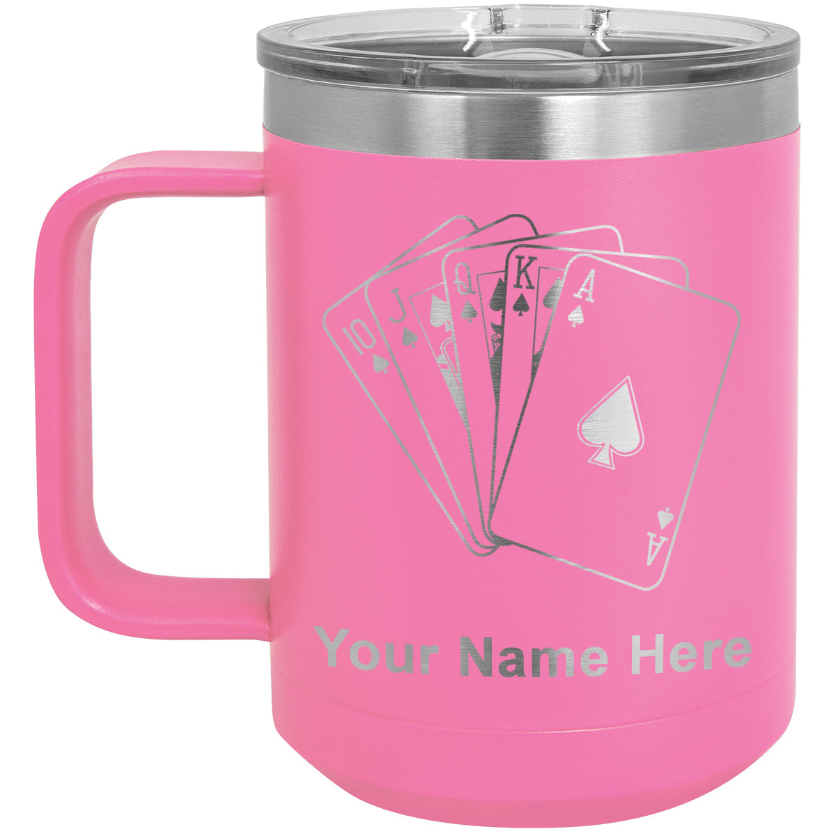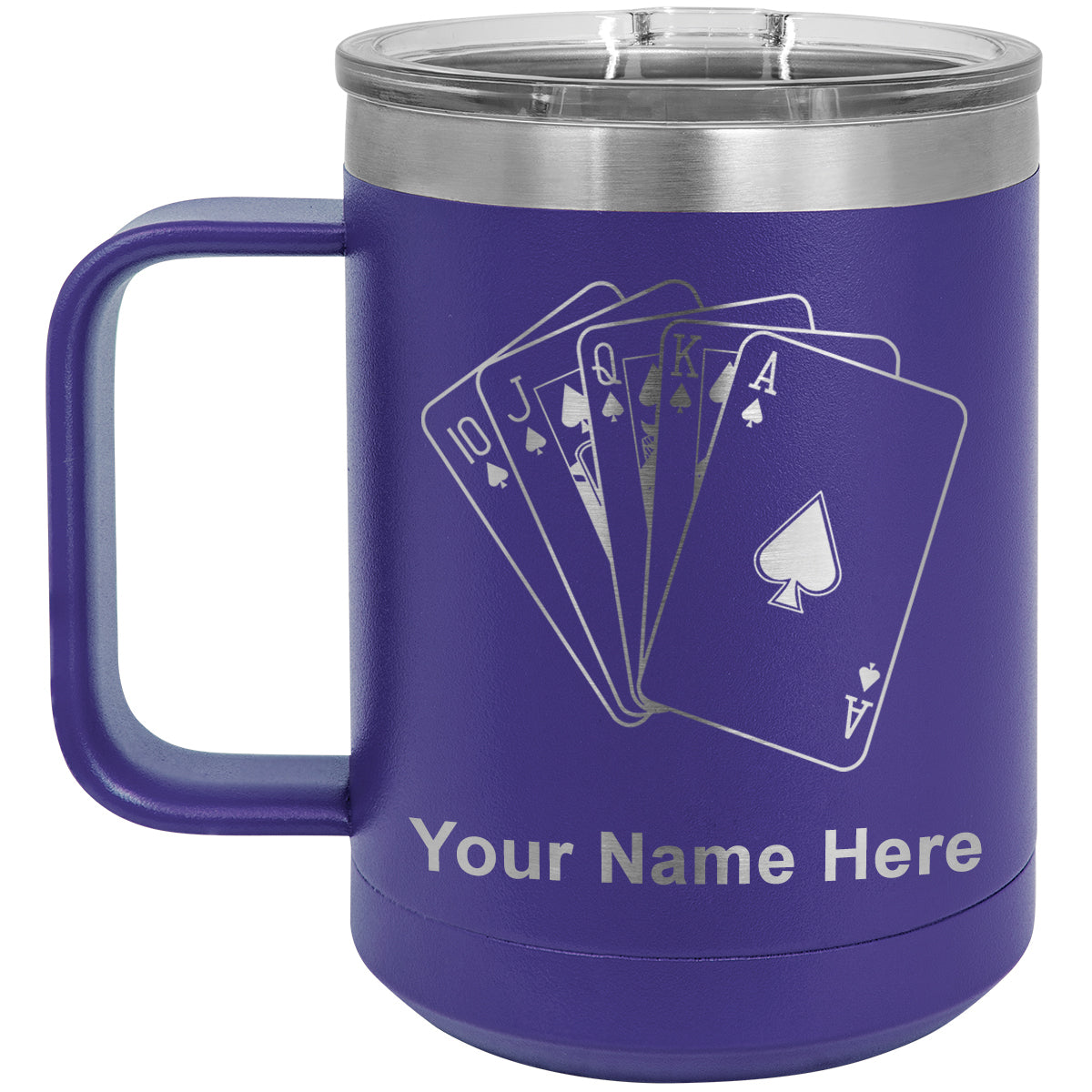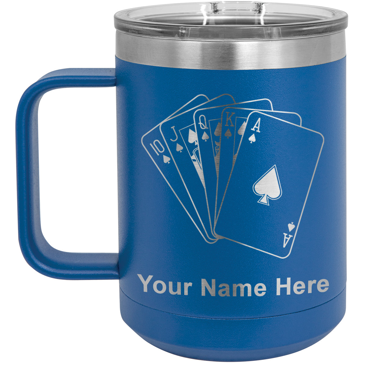 15oz Vacuum Insulated Coffee Mug, Royal Flush Poker Cards, Personalized Engraving Included