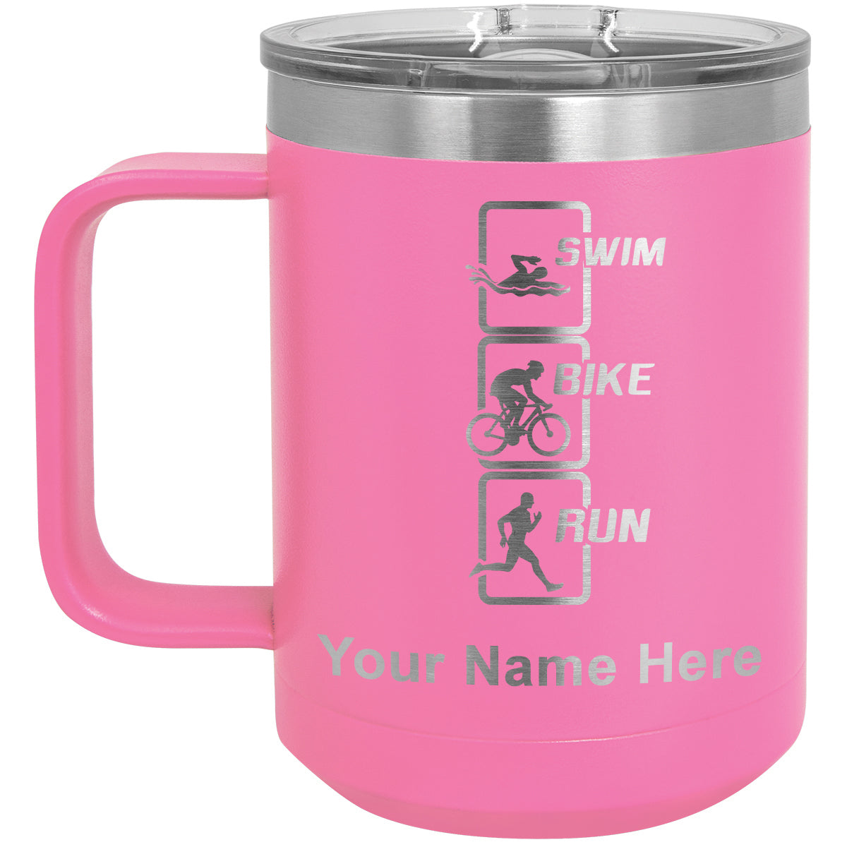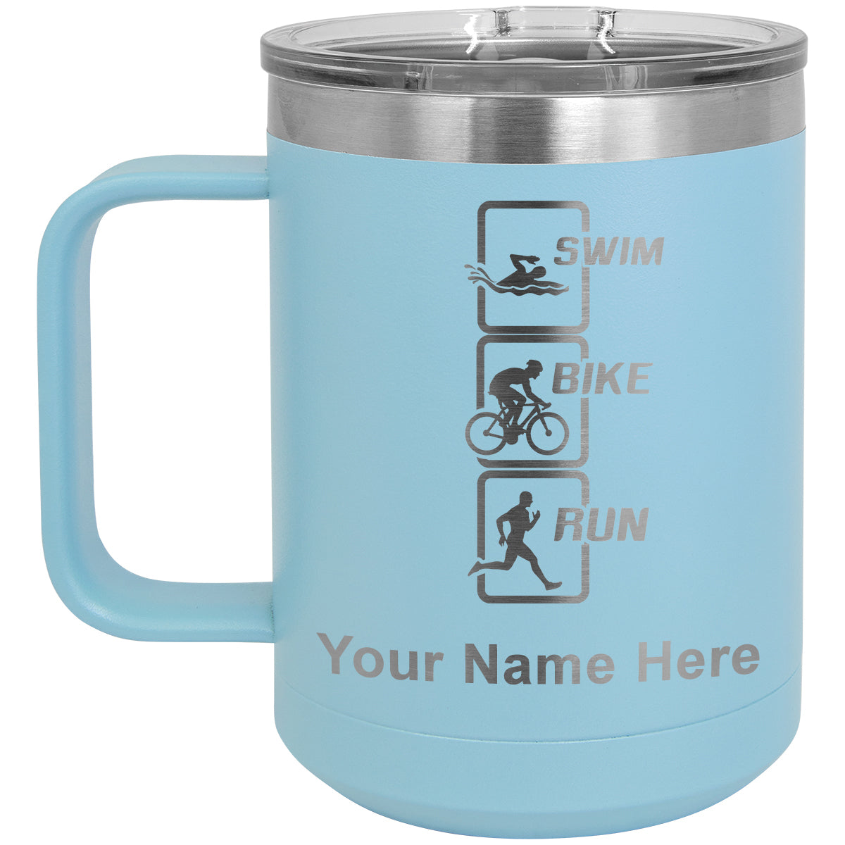 15oz Vacuum Insulated Coffee Mug, Swim Bike Run Vertical, Personalized Engraving Included