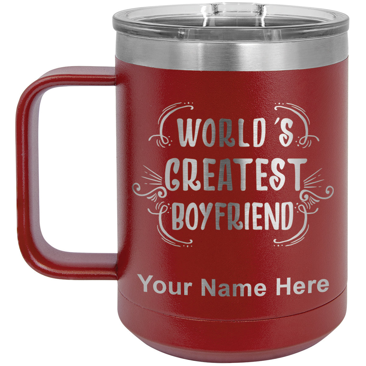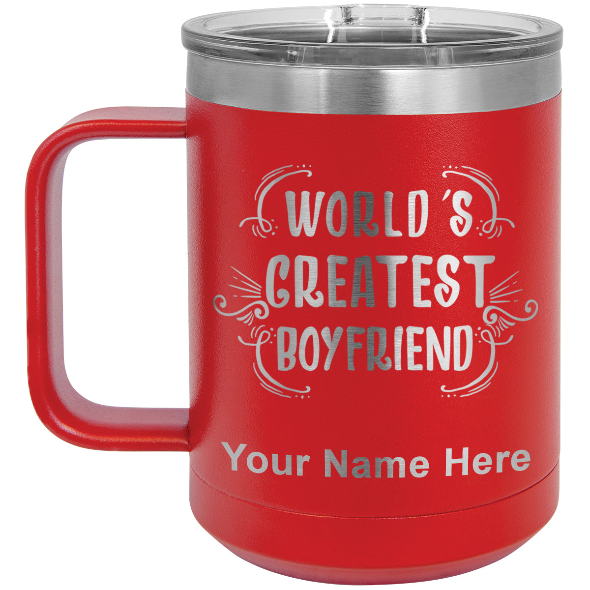 15oz Vacuum Insulated Coffee Mug, World's Greatest Boyfriend, Personalized Engraving Included