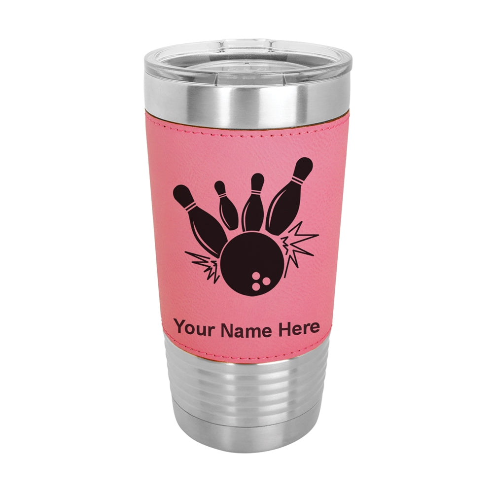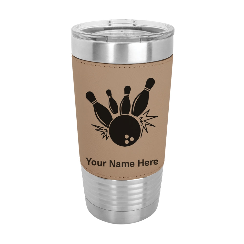 20oz Faux Leather Tumbler Mug, Bowling Ball and Pins, Personalized Engraving Included